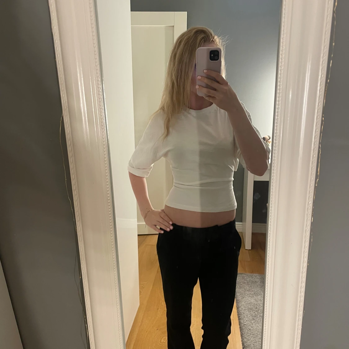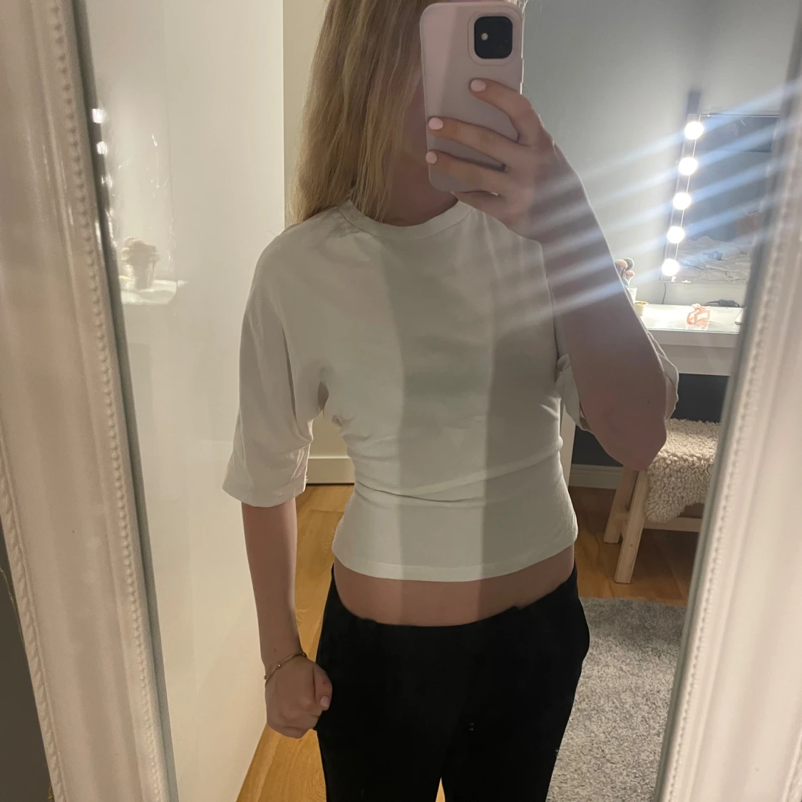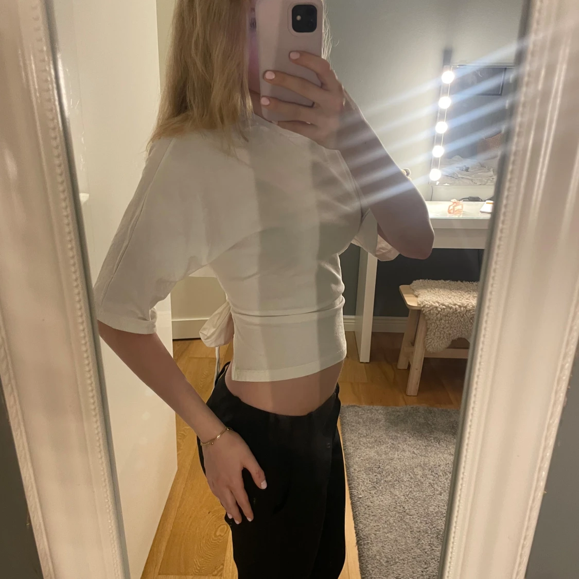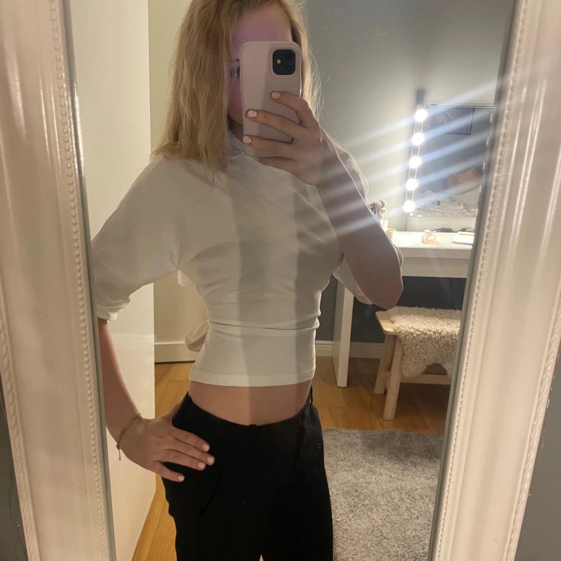 Säljer en vit topp med knyt i ryggen. Toppen har korta ärmar och går att anpassa hur tajt man vill ha den i midjan. Perfekt för dig som gillar stilrena och trendiga plagg med en twist.