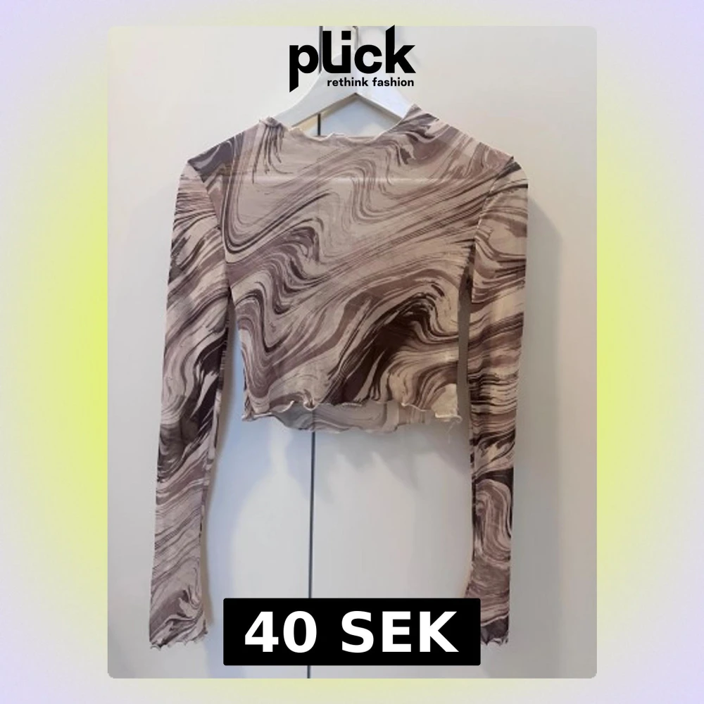 Säljer en croppad långärmad topp med unikt marmorerat mönster i olika nyanser av brunt och beige. Toppen har vågiga kanter vid ärmslut och nederkant för en cool touch. Perfekt för dig som gillar statement-plagg med snygg passform.