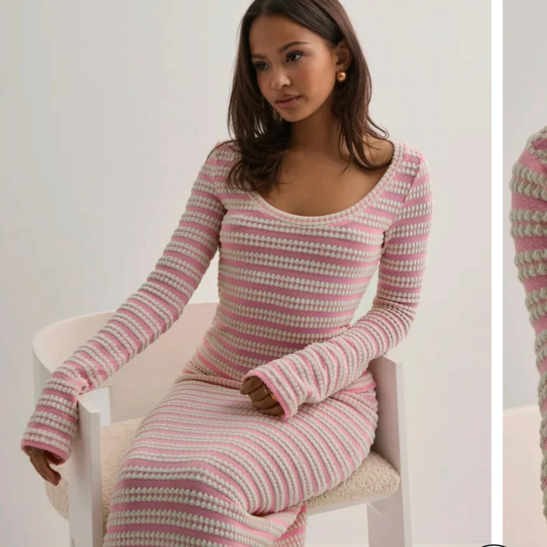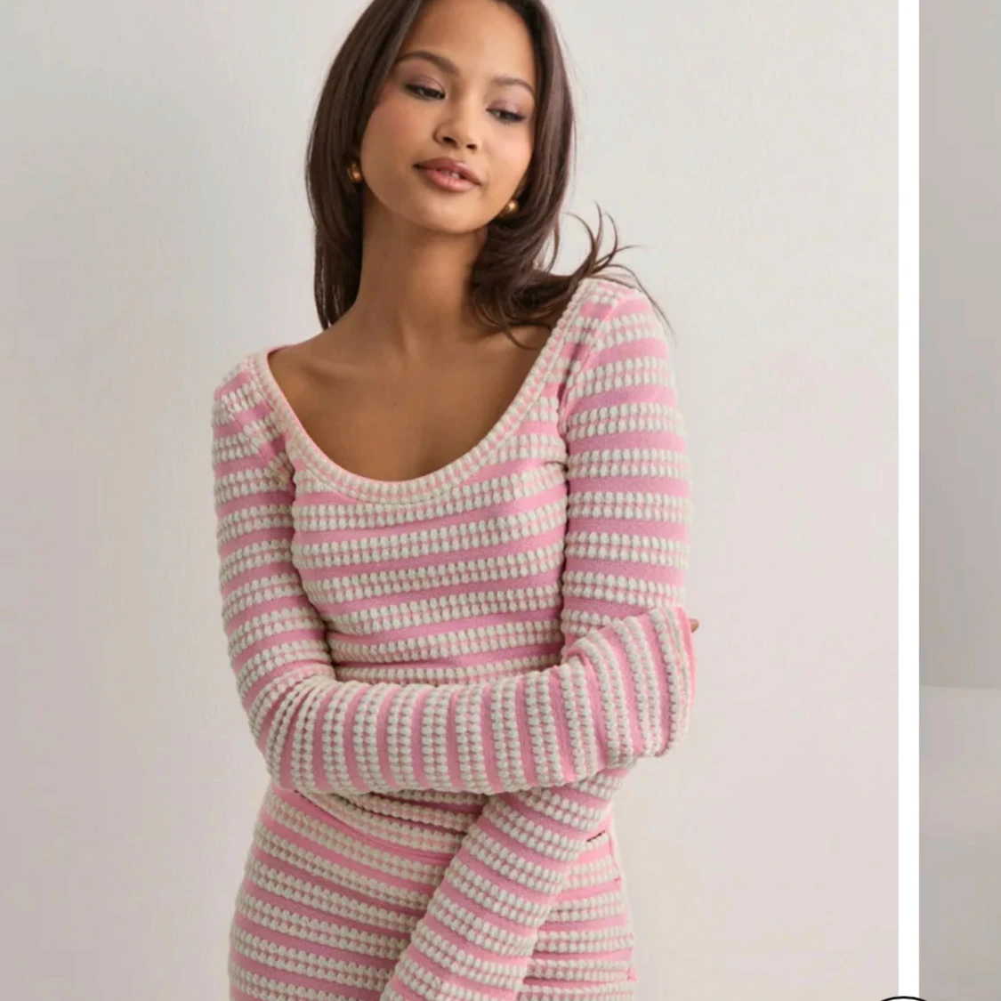 Superfin tröja med rosa och vita ränder. Tröjan är stickad, har lång ärm och en snygg rundad urringning. Den är figurnära och har en mjuk, cozy känsla – perfekt för dig som gillar en söt och chill stil.