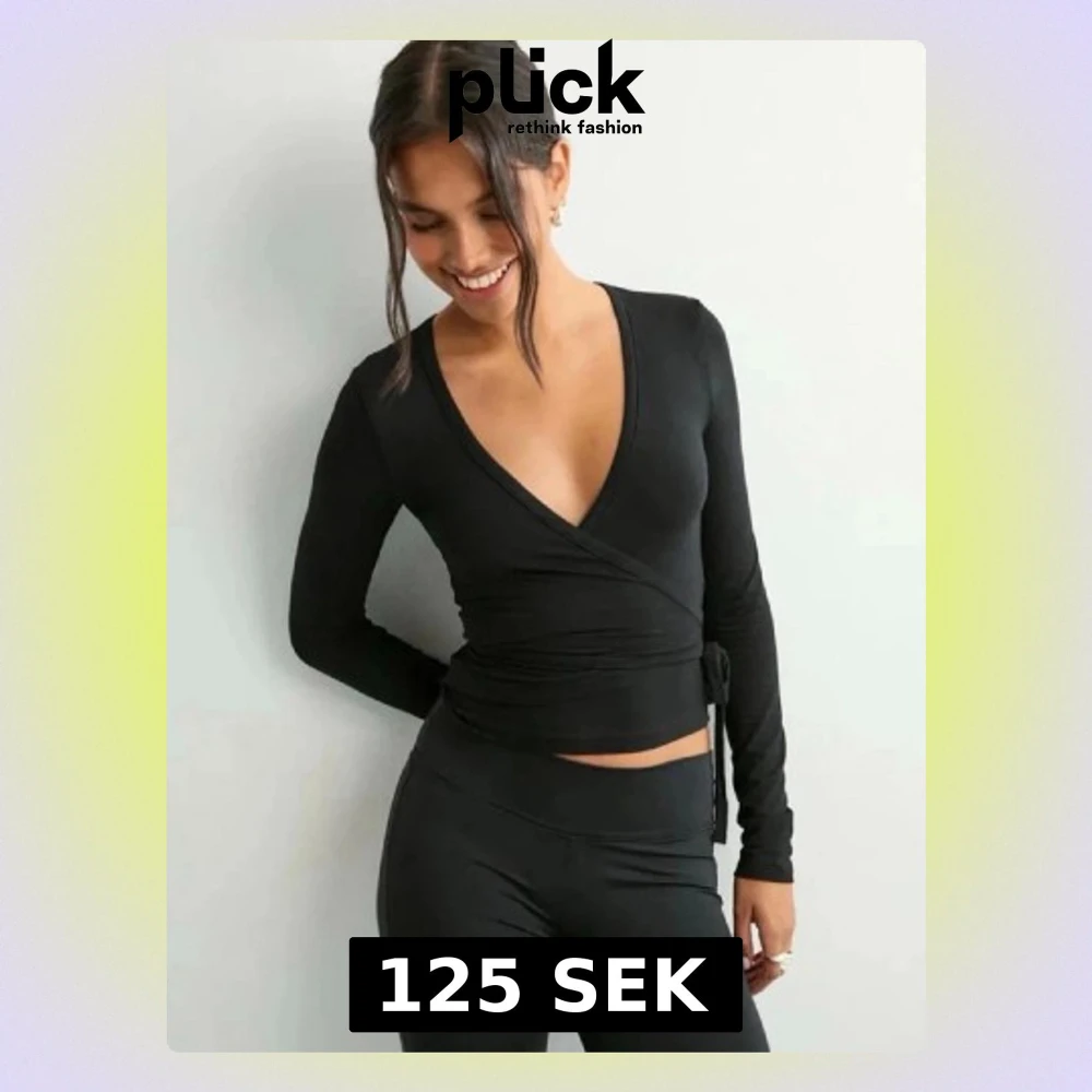 Svart långärmad omlottopp från Nelly med knyt i sidan och djup v-ringning. Tunn och mjuk i materialet, liten i storlek. Sparsamt använd, nyskick.