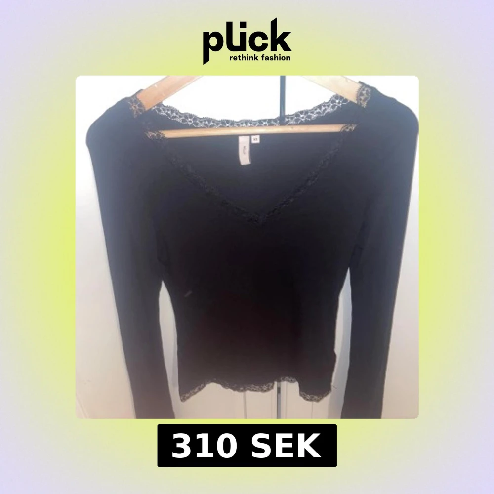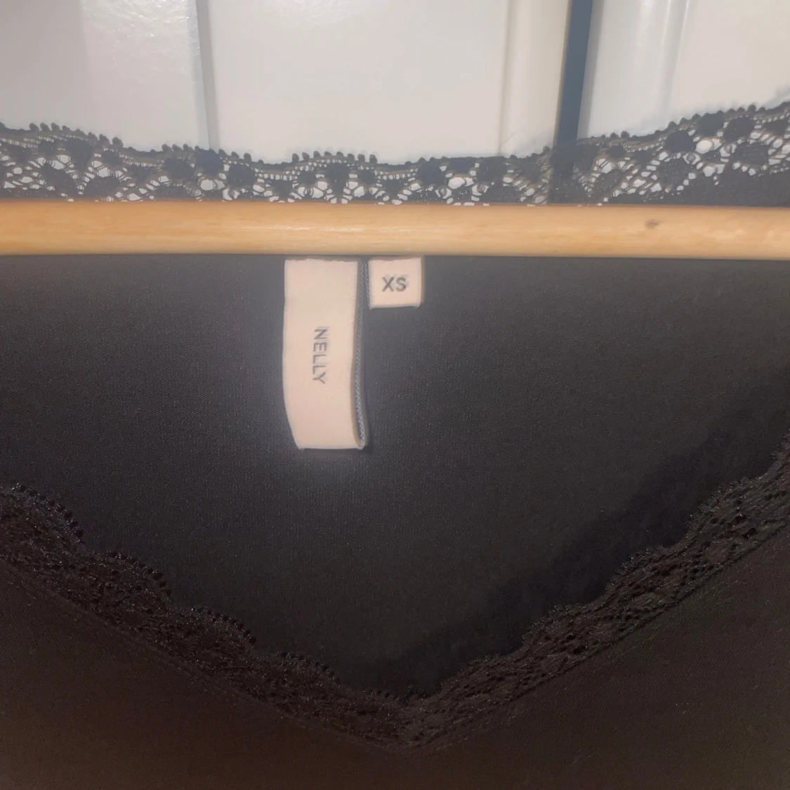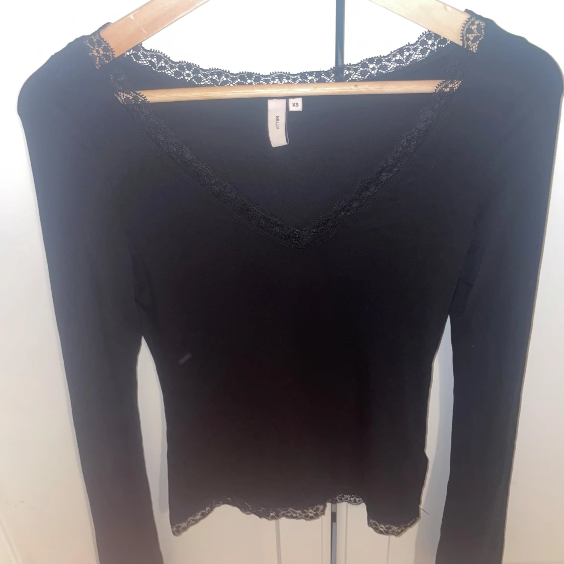 Svart långärmad topp från Nelly i storlek XS. Toppen har v-ringning och är dekorerad med fin spets längs halsringning och nederkant. Snygg och enkel modell som är lätt att matcha till olika looks aldrig använd stora i storlek så passar xs-s