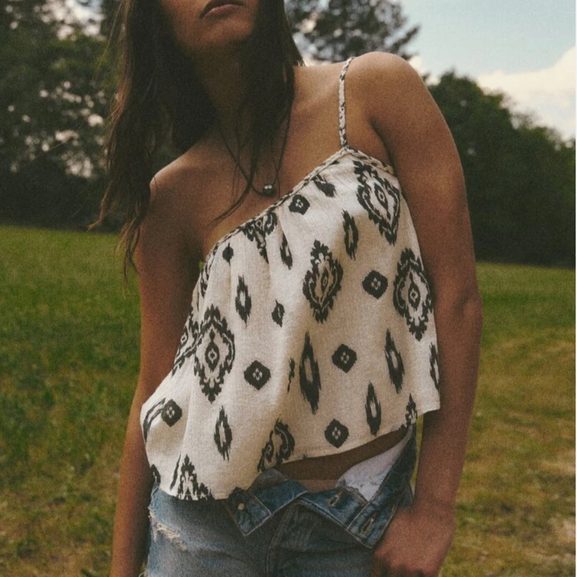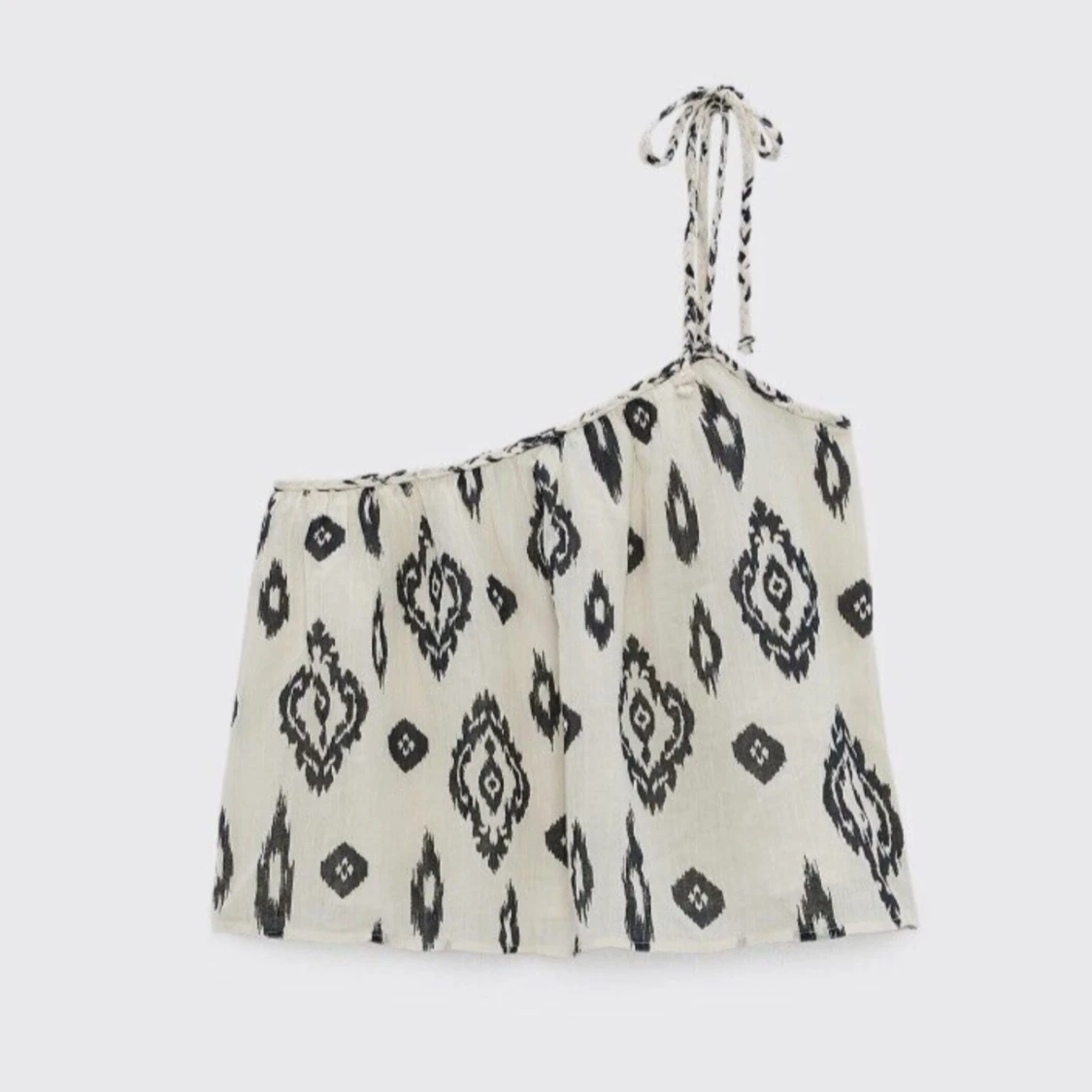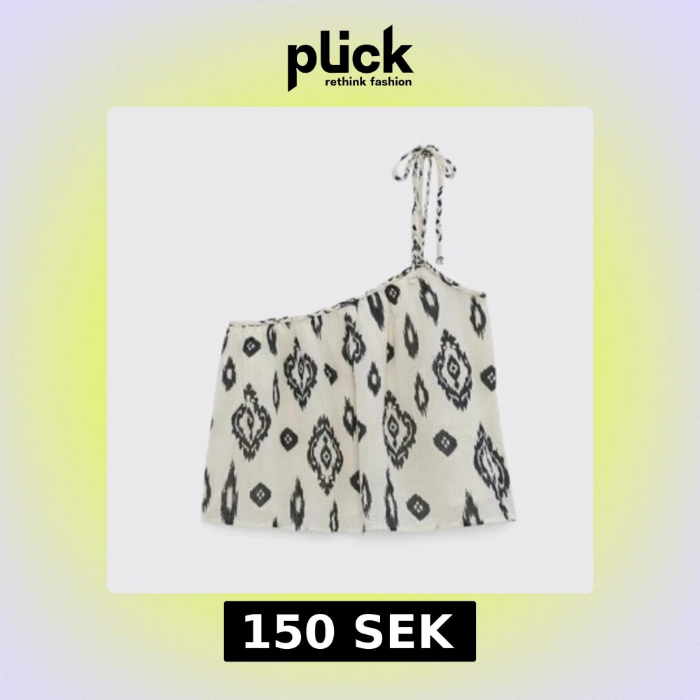 Snygg oneshoulder topp i vitt med svart grafiskt mönster. Toppen har ett smalt axelband med knyt och är luftig och croppad i modellen. Perfekt för varma dagar och ger en avslappnad vibe till din outfit.