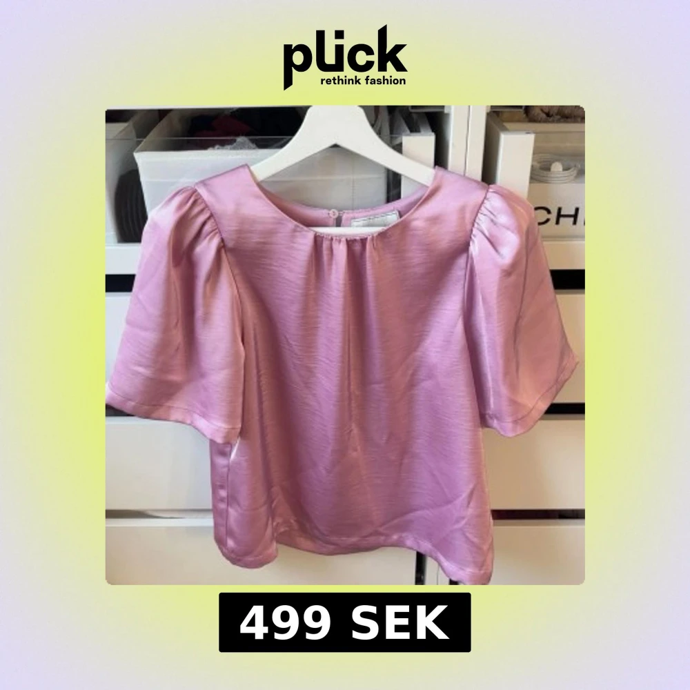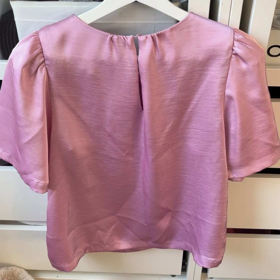 Supersöt rosa blus i glansigt satinmaterial med korta puffärmar och rund halsringning. Blusen har en avslappnad passform och knäppning bak i nacken. Perfekt för dig som vill ha en feminin och trendig look.