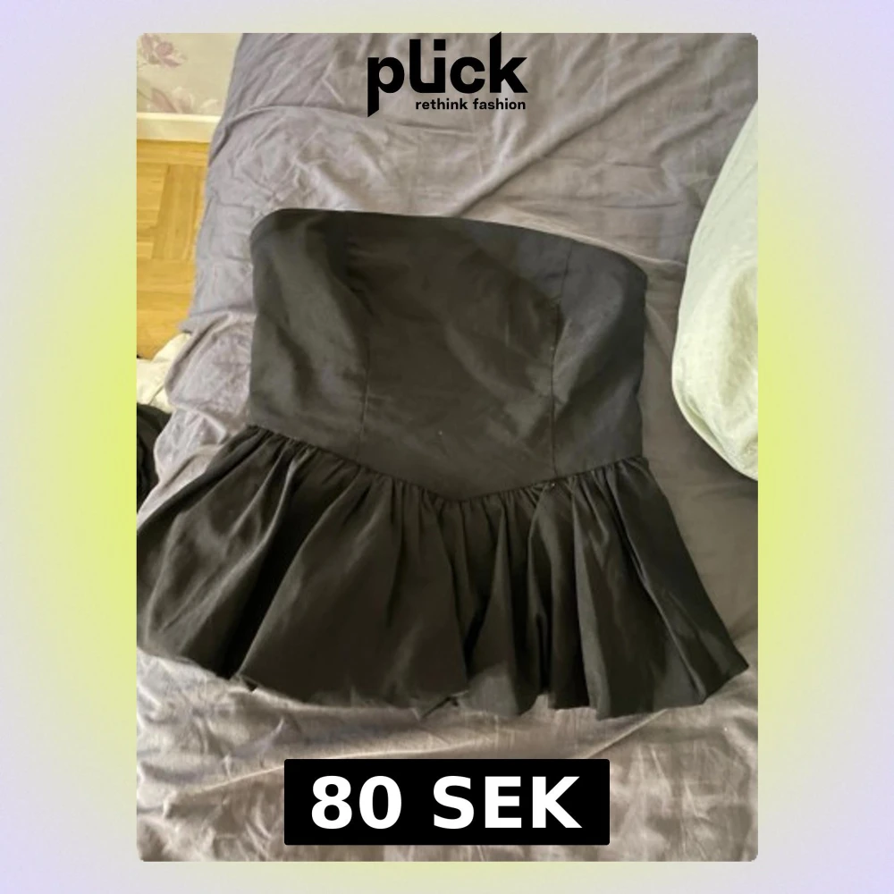 Säljer en svart axelbandslös tubtopp med bred volang nedtill. Toppen har en figurnära passform upptill och är sydd i ett mjukt tyg som ger en snygg siluett. Perfekt för dig som vill ha en statement piece till garderoben.