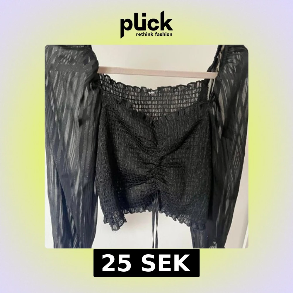 Säljer en svart blus med smockad kropp och transparenta, långärmade meshärmar med subtila ränder. Toppen har croppad passform, volangkant och snörning framtill för extra detalj. Perfekt för dig som gillar trendiga och unika plagg.