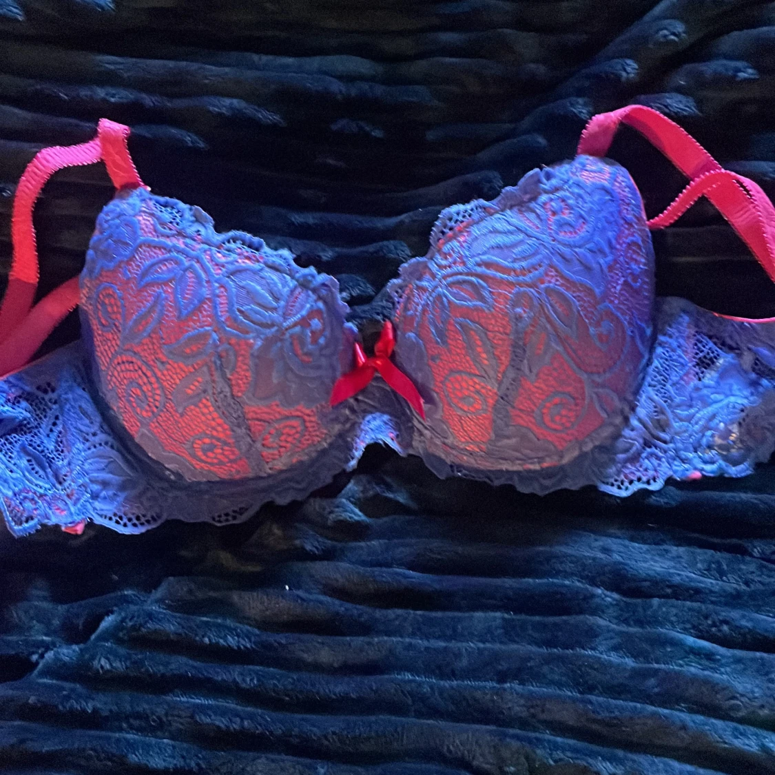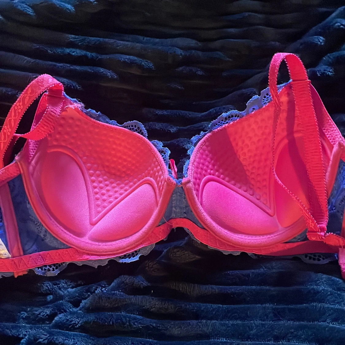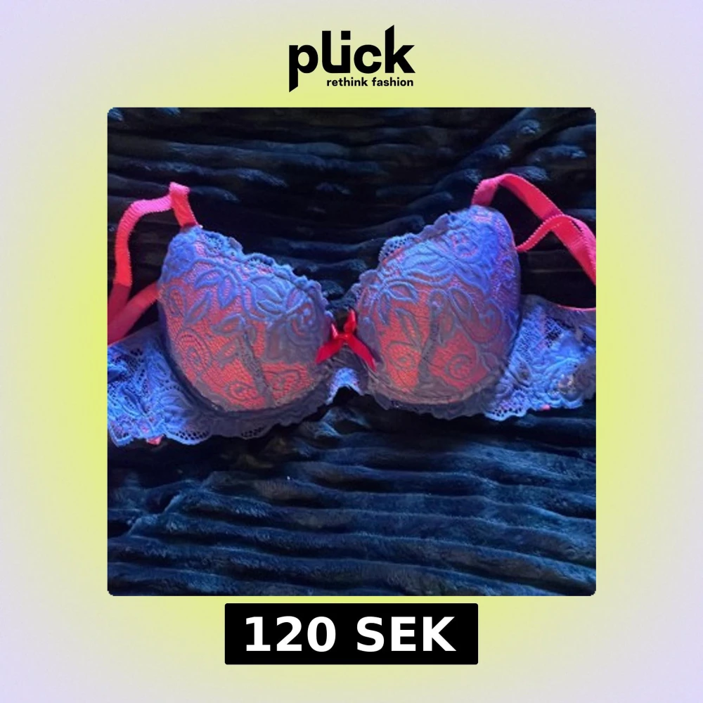 Säljer en snygg bh i blå spets med rosa detaljer och axelband. Kuporna är vadderade och har en liten rosa rosett framtill. Spetsen har ett blommigt mönster och bh:n har justerbara axelband för bästa passform.