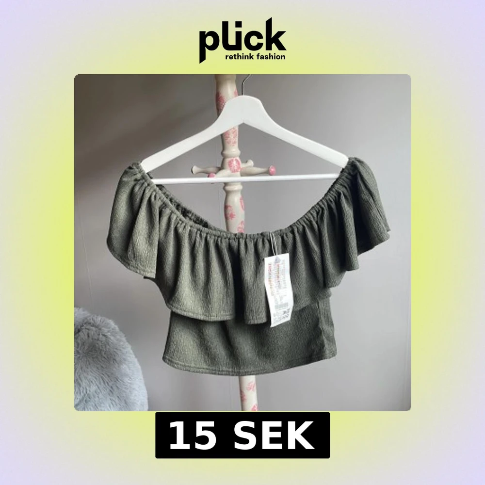 Snygg grön offshoulder topp med bred volang runt hela axelpartiet.