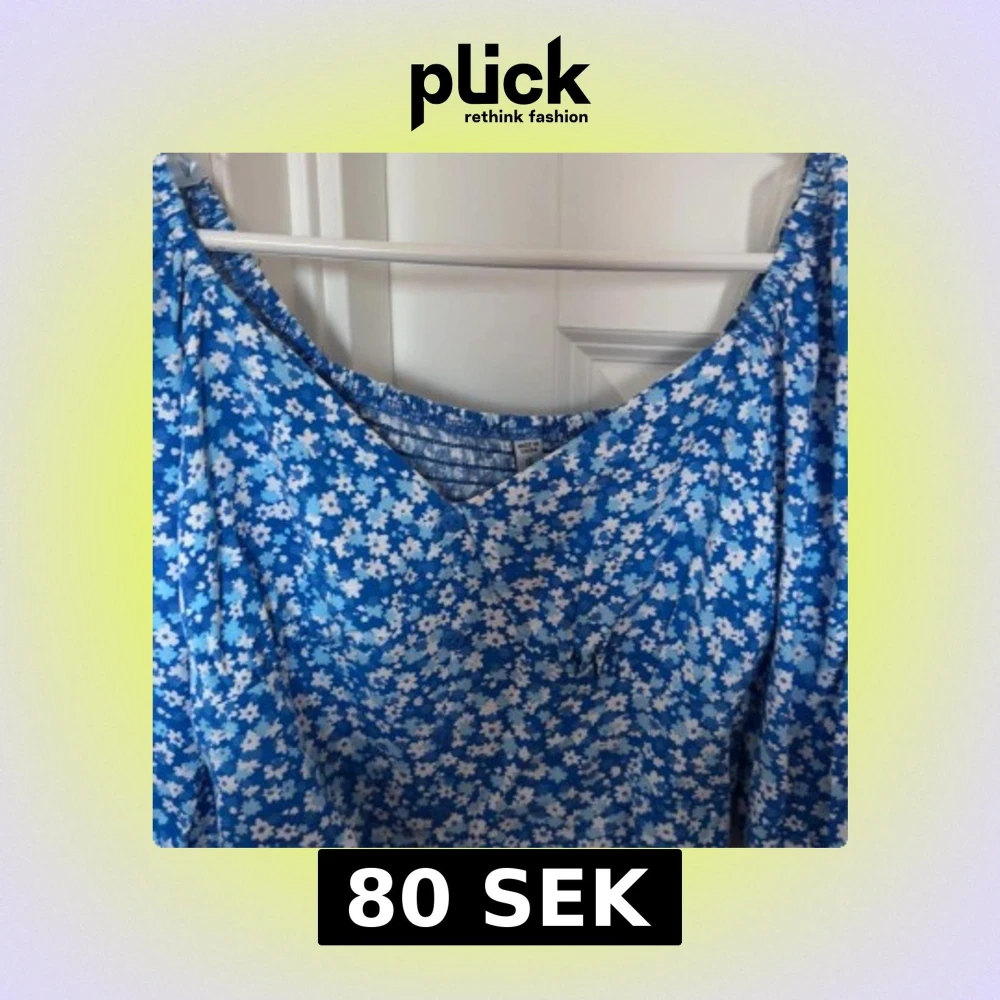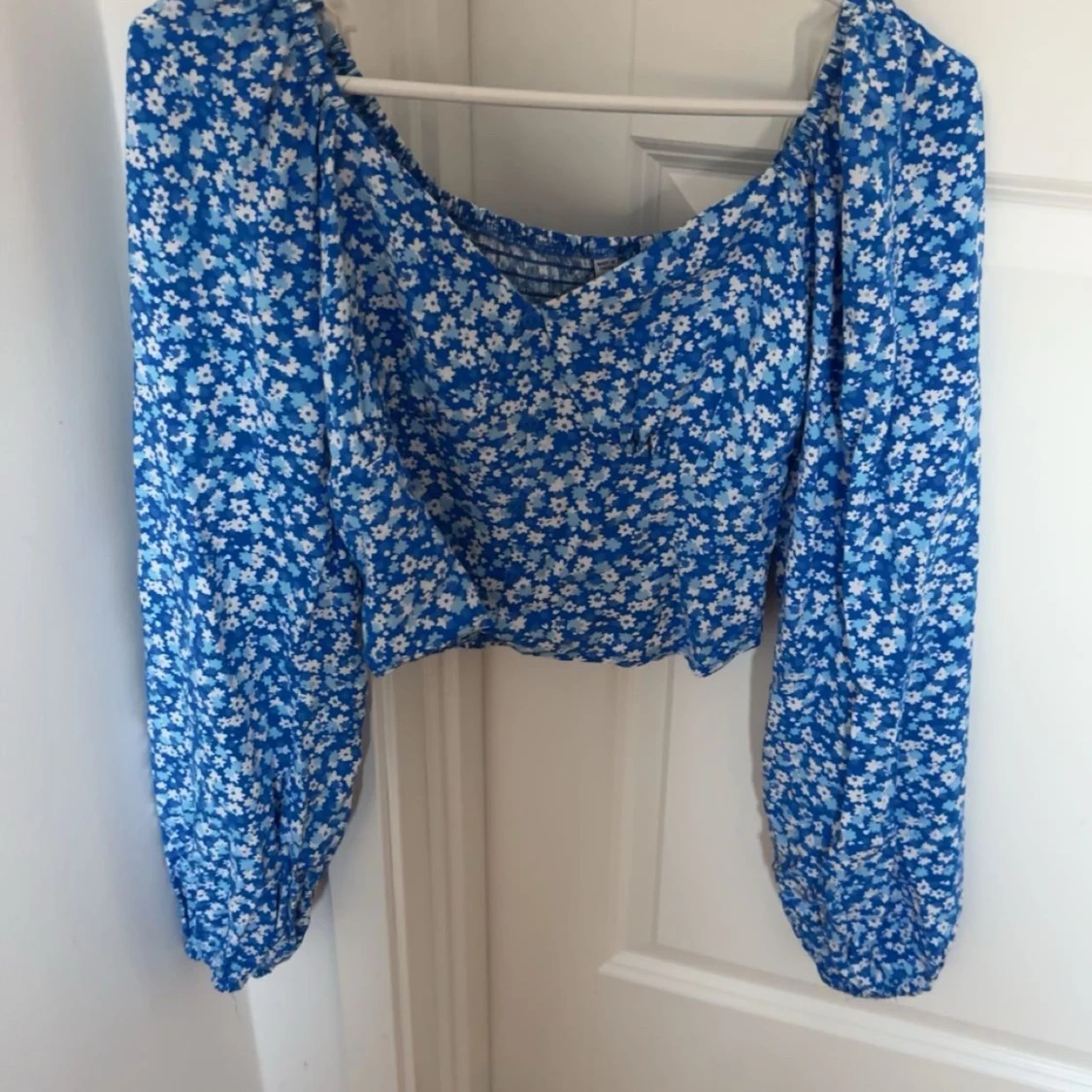 Säljer en blå croppad blus med vitt blommönster och långa puffärmar. Toppen har v-ringning och är perfekt för vår och sommar. Superfin att styla med jeans eller kjol! Dm mig om nu vill ha bilder med den på