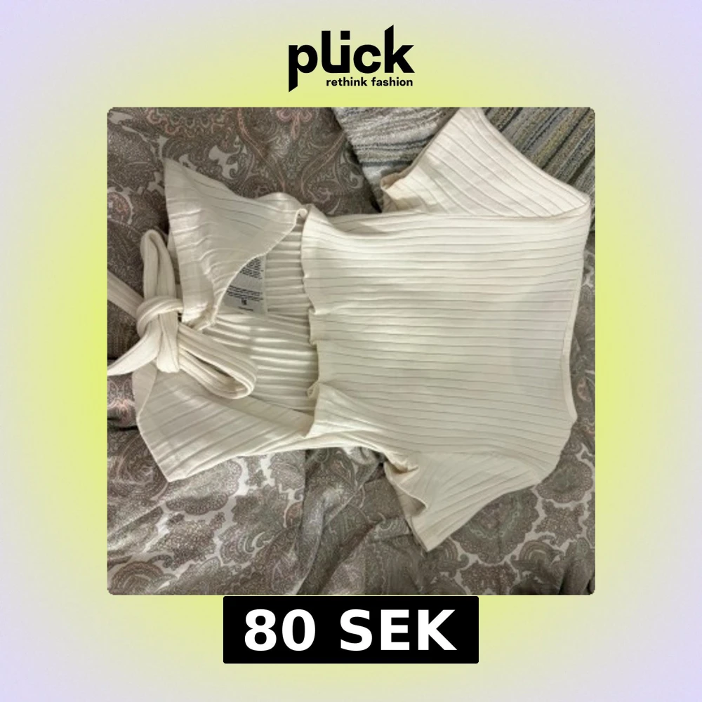 Superfin vit ribbad omlottopp från H&M med korta ärmar och knyt i sidan. Toppen har en mjuk och stretchig känsla och är perfekt för att skapa en chill men ändå snygg look. Passar till både jeans och kjol för en trendig vibe. Liten fläck på framsidan men syns knappt