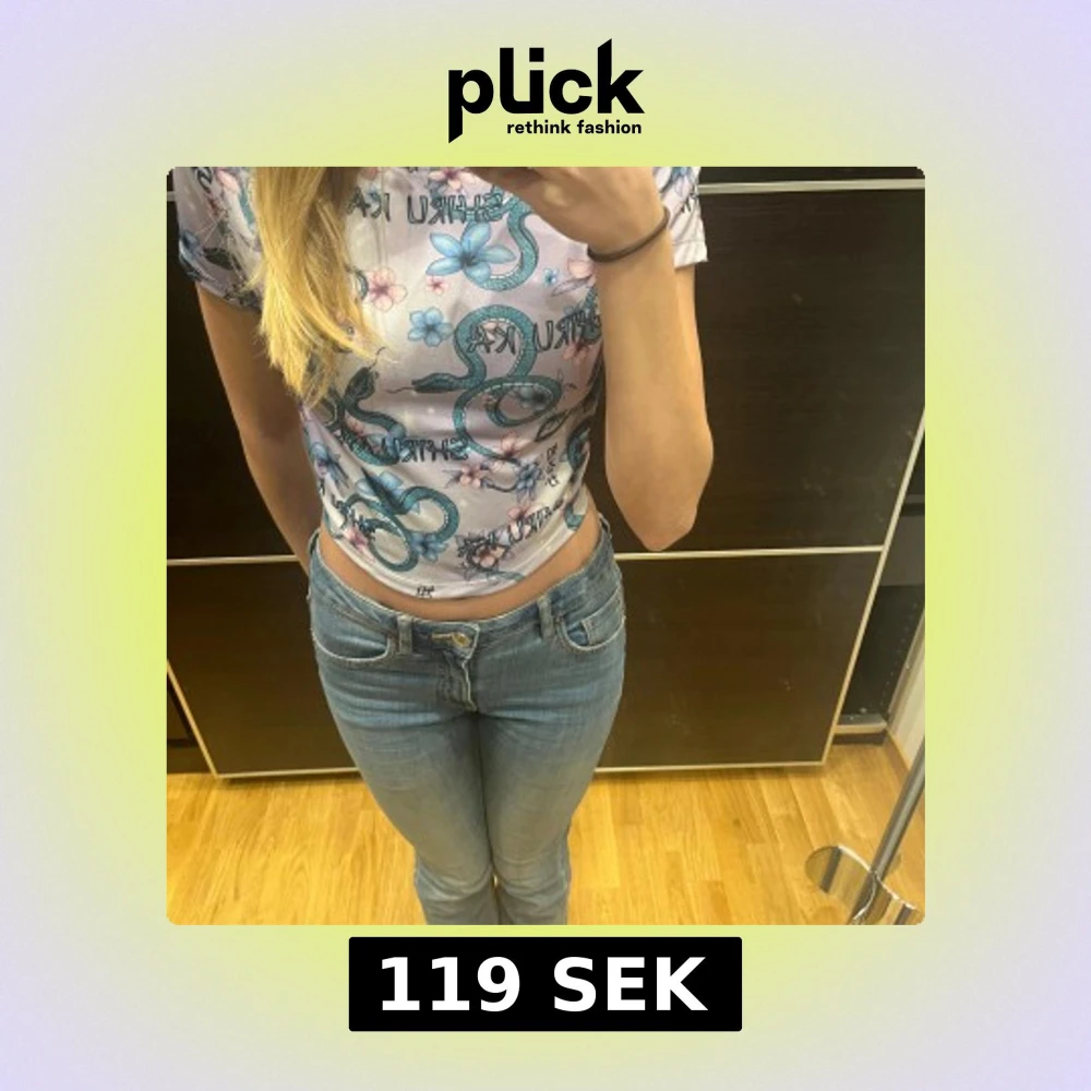 Trendig kortärmad topp med ett unikt mönster av ormar och blommor i blått och rosa. Toppen har en öppen rygg och knyte där bak.