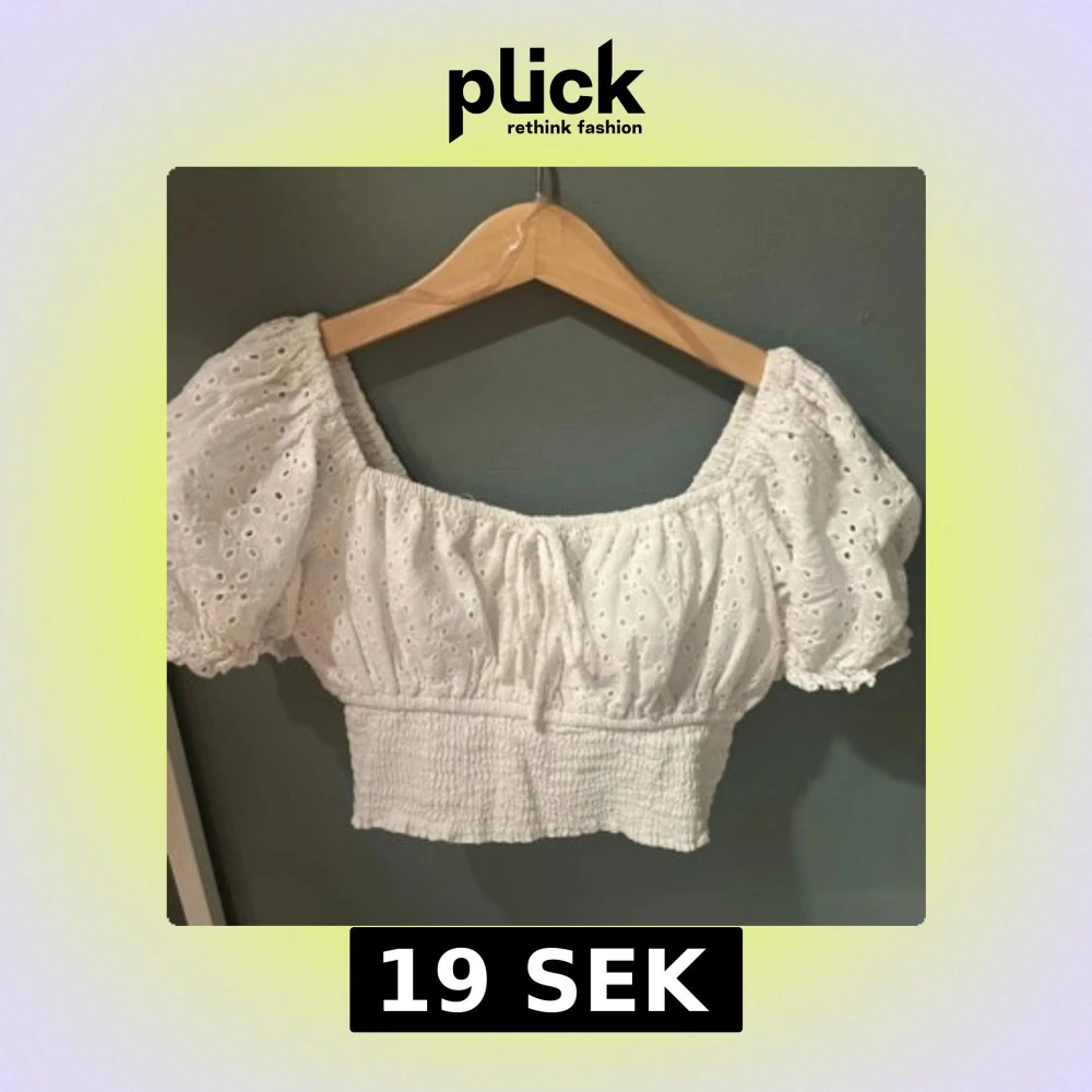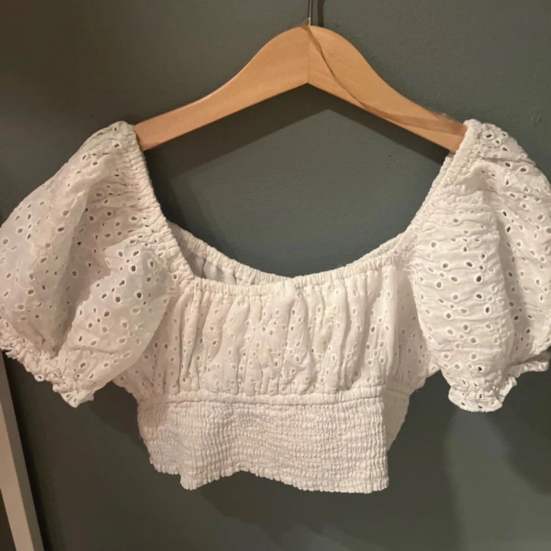 Supersöt vit croppad blus med broderade hål och puffiga korta ärmar. Toppen har smockad midja och elastisk halsringning som kan bäras offshoulder. Perfekt för sommarens alla tillfällen och ger en romantisk vibe.