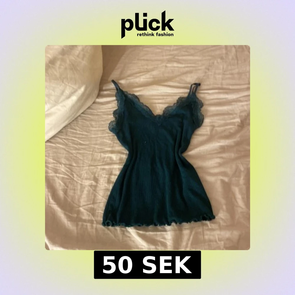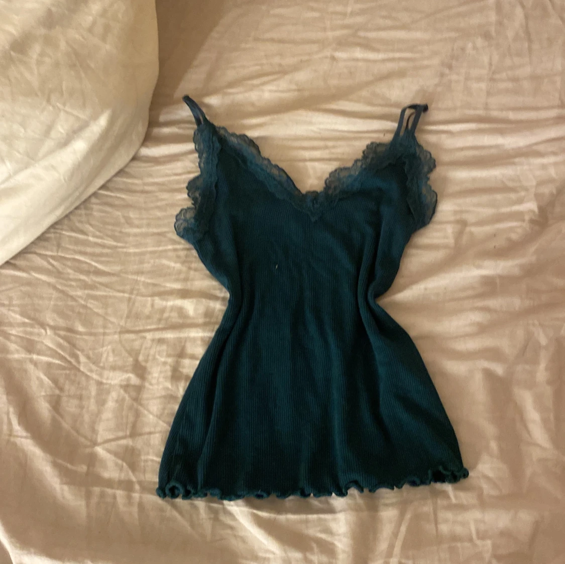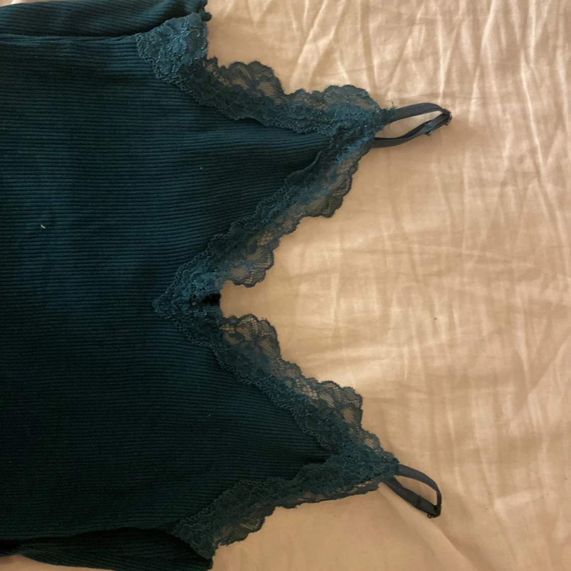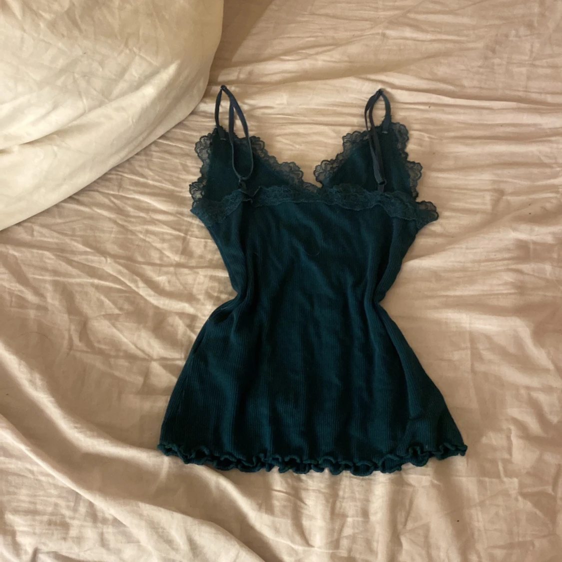 Snygg mörkgrön ribbad linnetopp med spetsdetaljer vid halsringningen. Perfekt för en stilren och bekväm look. Justerbara axelband för bästa passform.