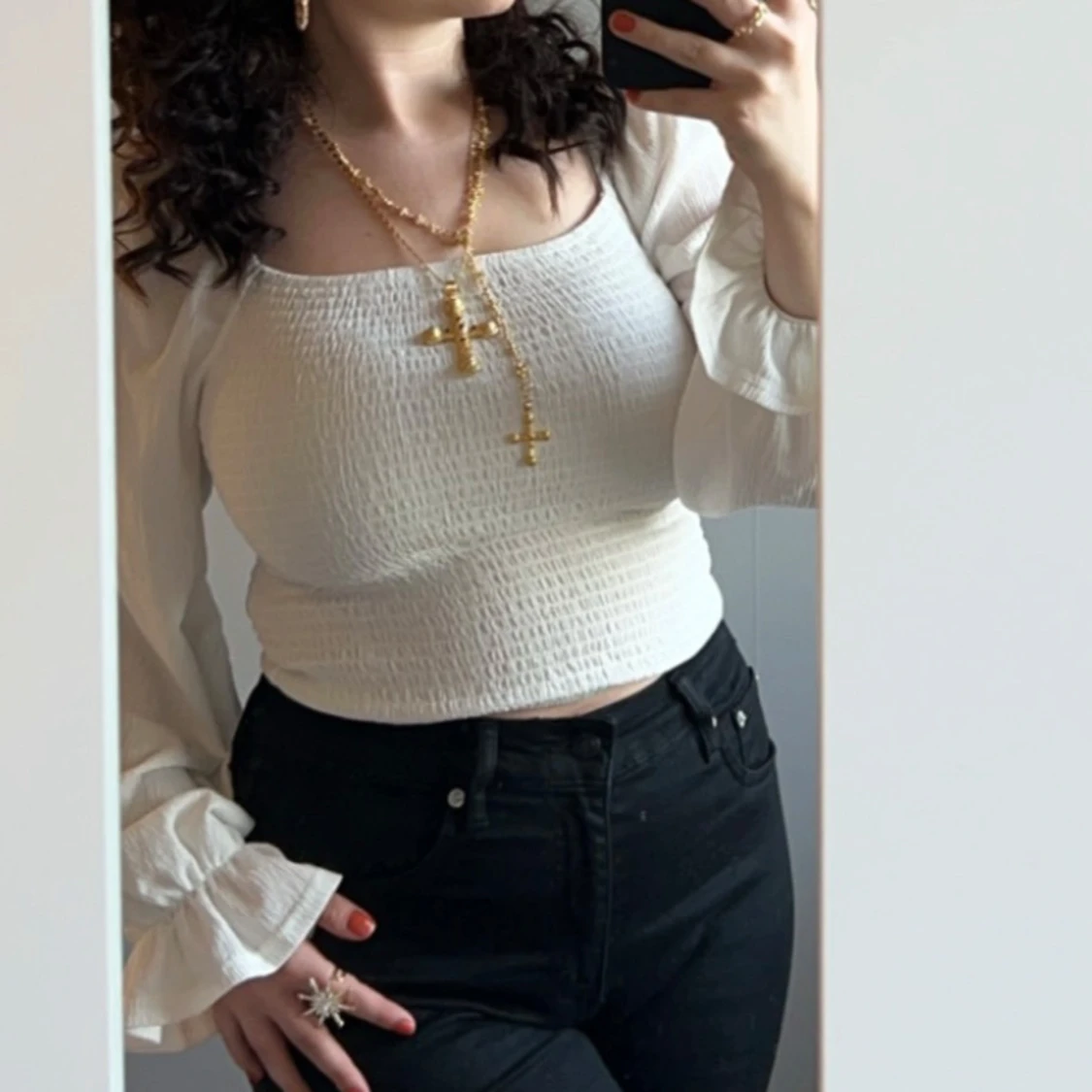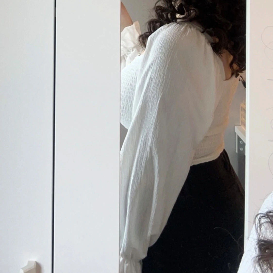 Säljer en stilren vit blus med smockad design och långa ärmar. Blusen har en åtsittande passform upptill och vida ärmar som ger en elegant look. Perfekt för att klä upp eller ner beroende på tillfälle.