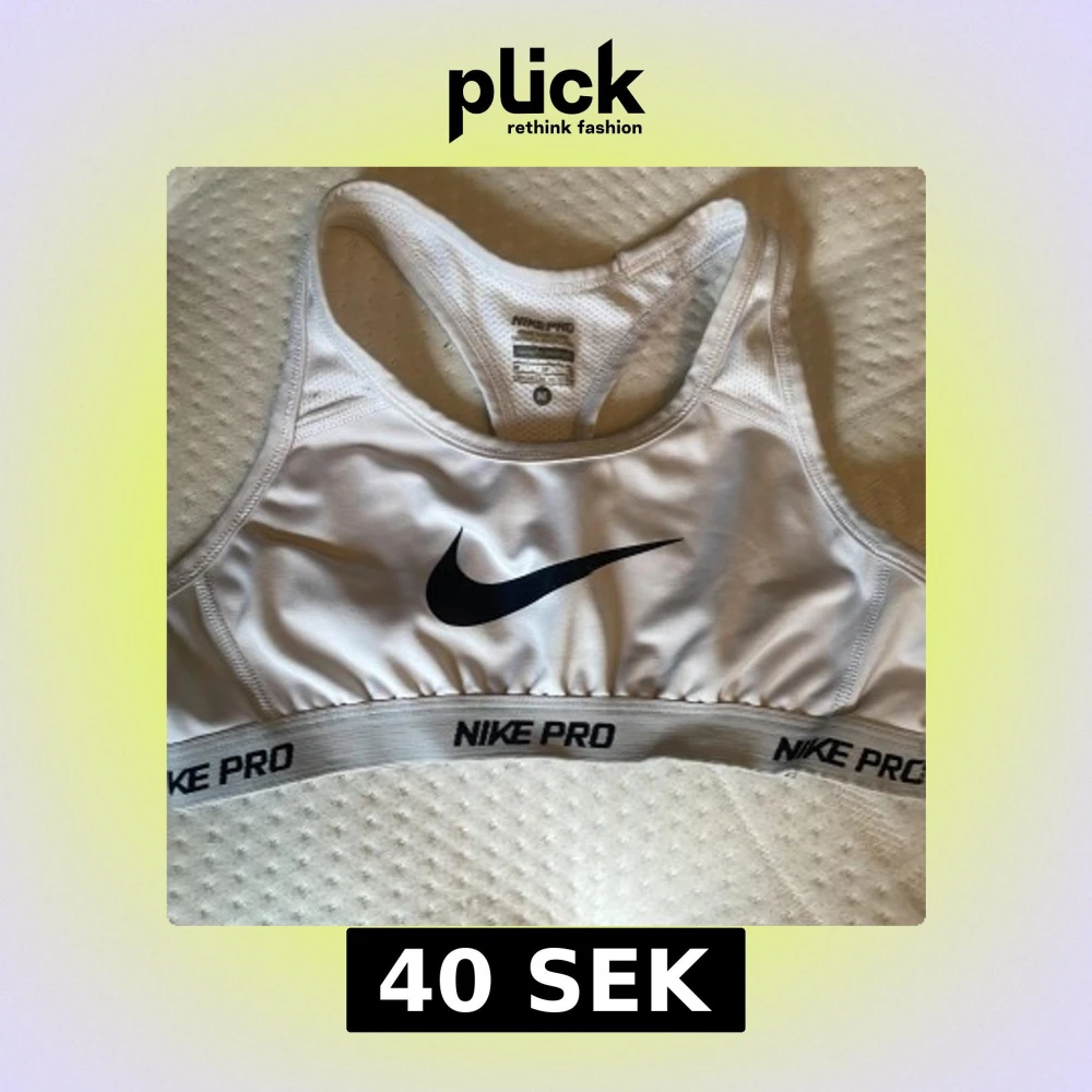 Säljer en vit sport-bh från Nike Pro med svart logga framtill och resår med Nike Pro-tryck. Modellen har brottarrygg och är tillverkad i ett funktionsmaterial som andas. Perfekt för träning och sportaktiviteter.