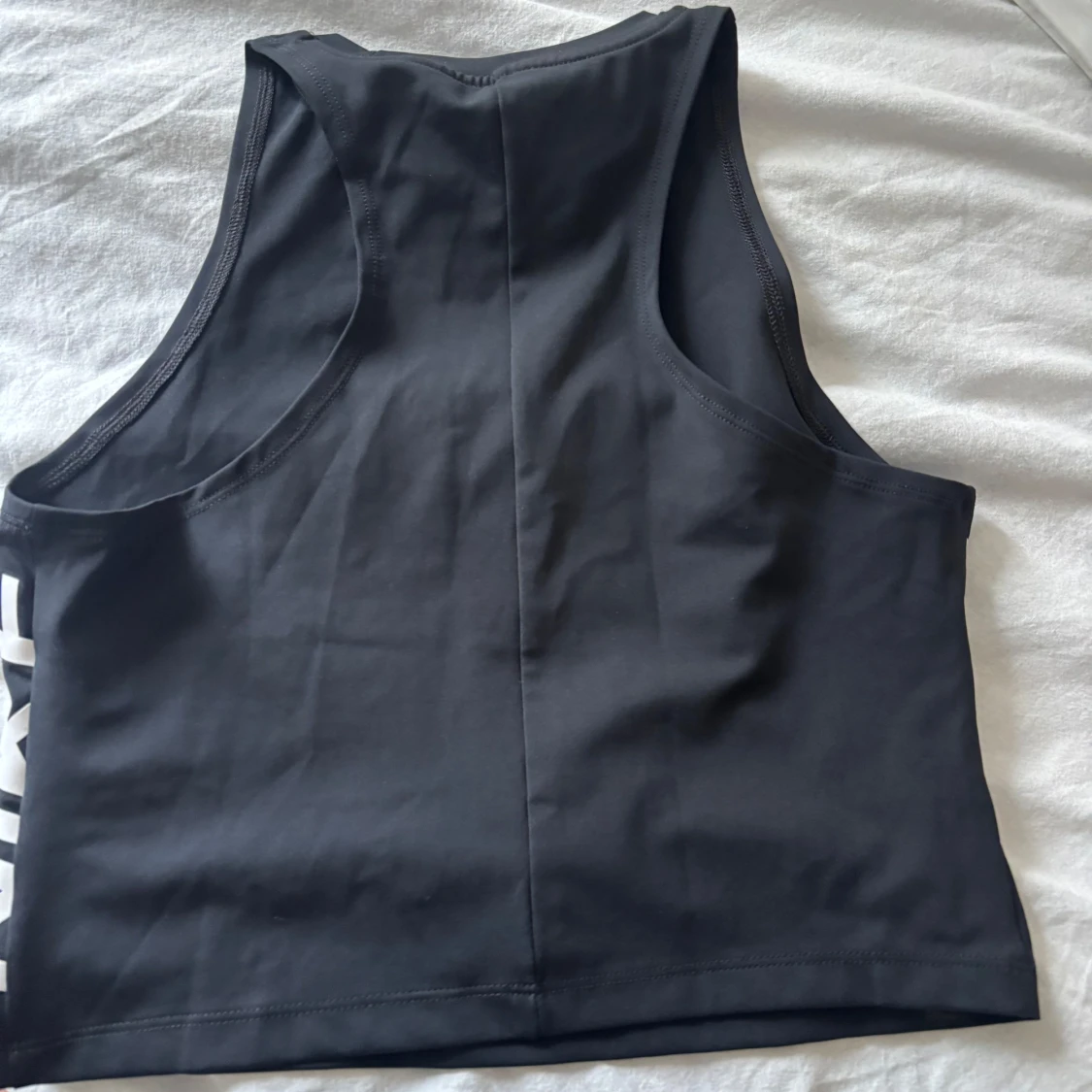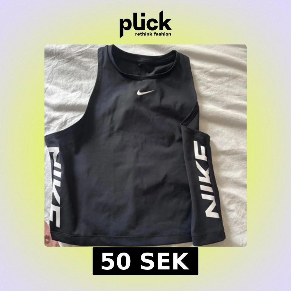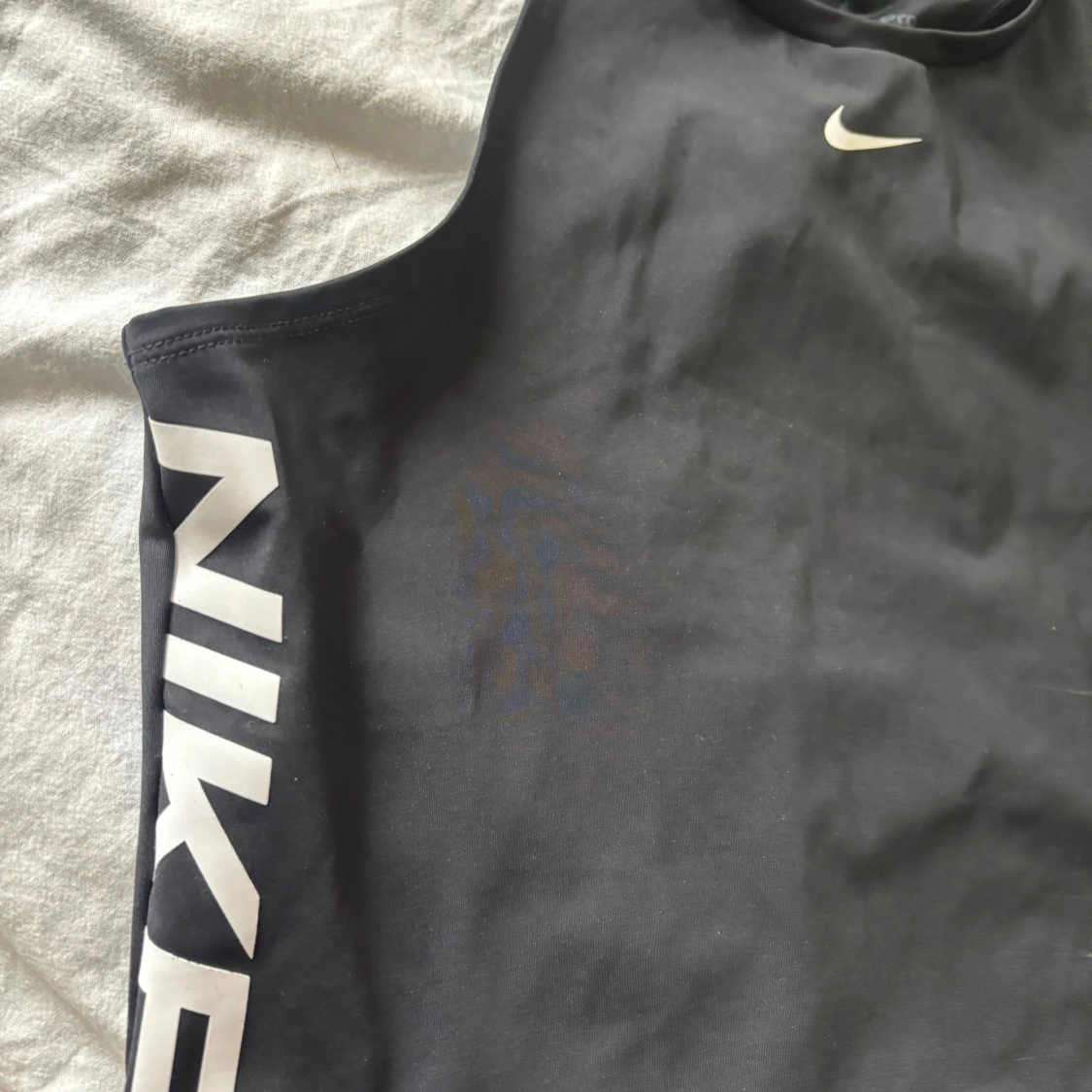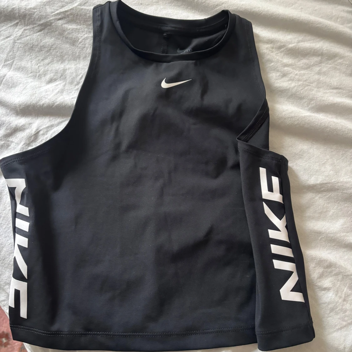Sportig svart linnetopp från Nike Pro med Dri-FIT-teknologi. Toppen har en croppad passform, ärmlös design och stora vita Nike-loggor längs sidorna. Perfekt för träning och gym, tillverkad i ett stretchigt syntetmaterial som andas.
