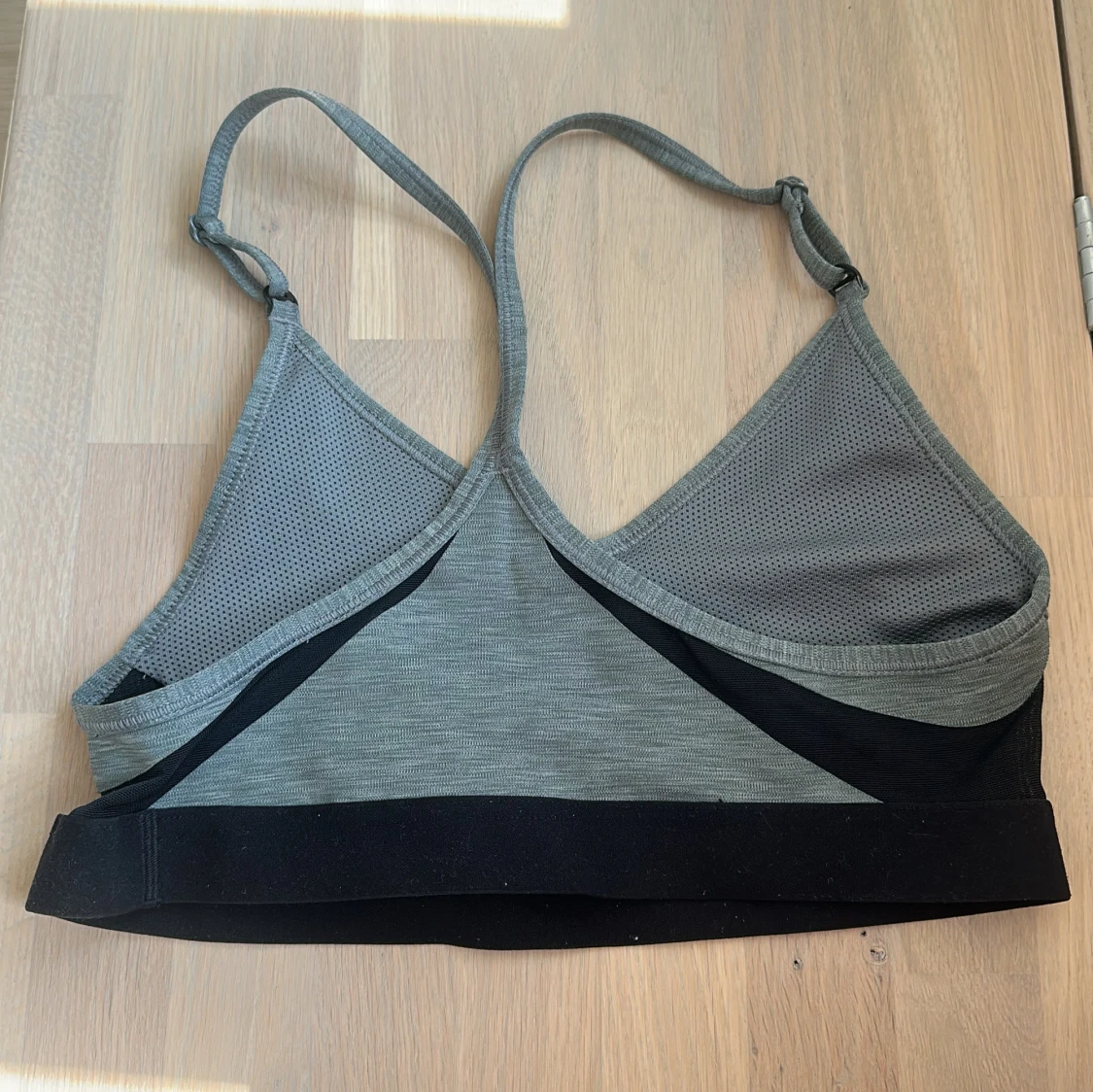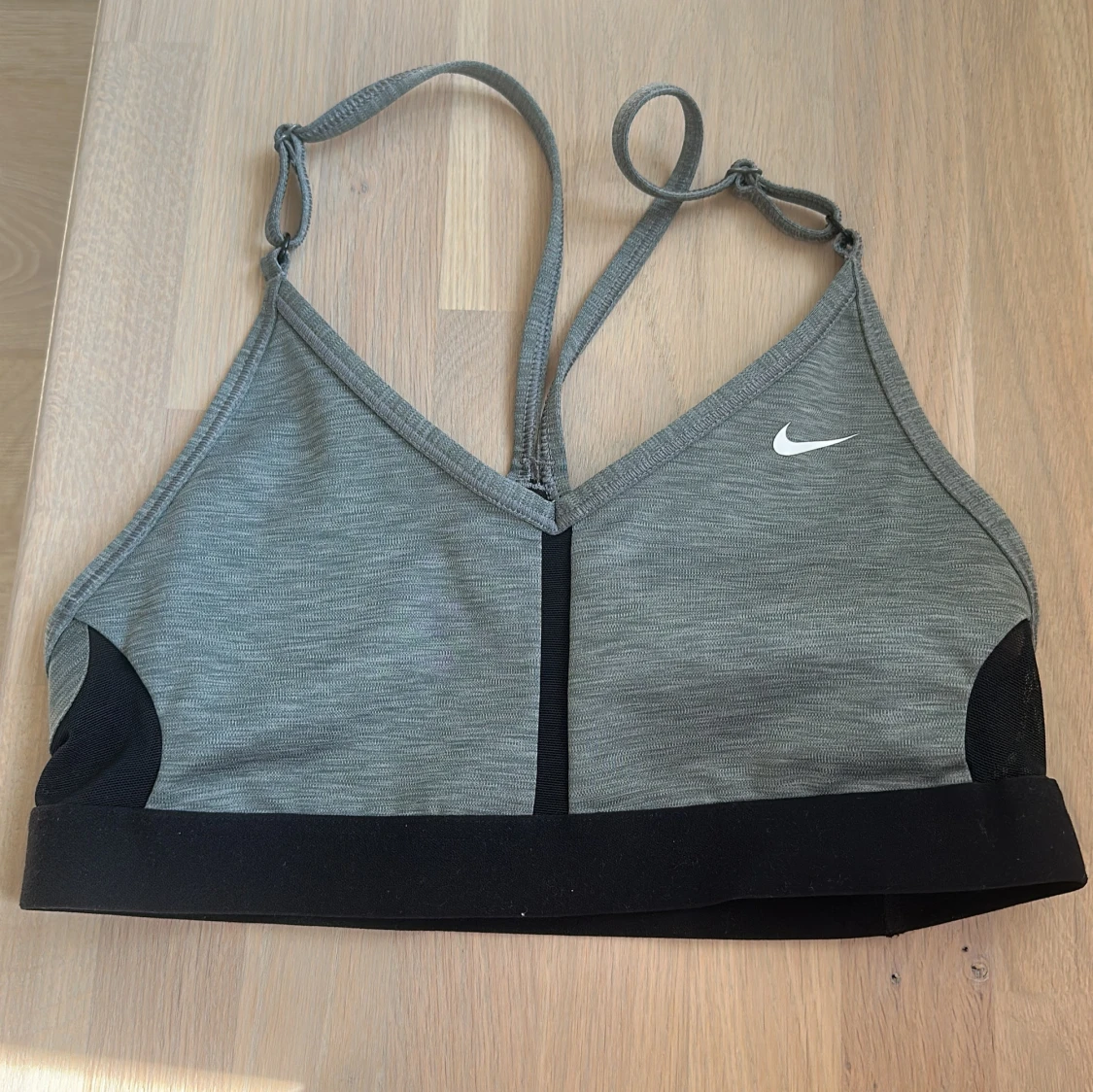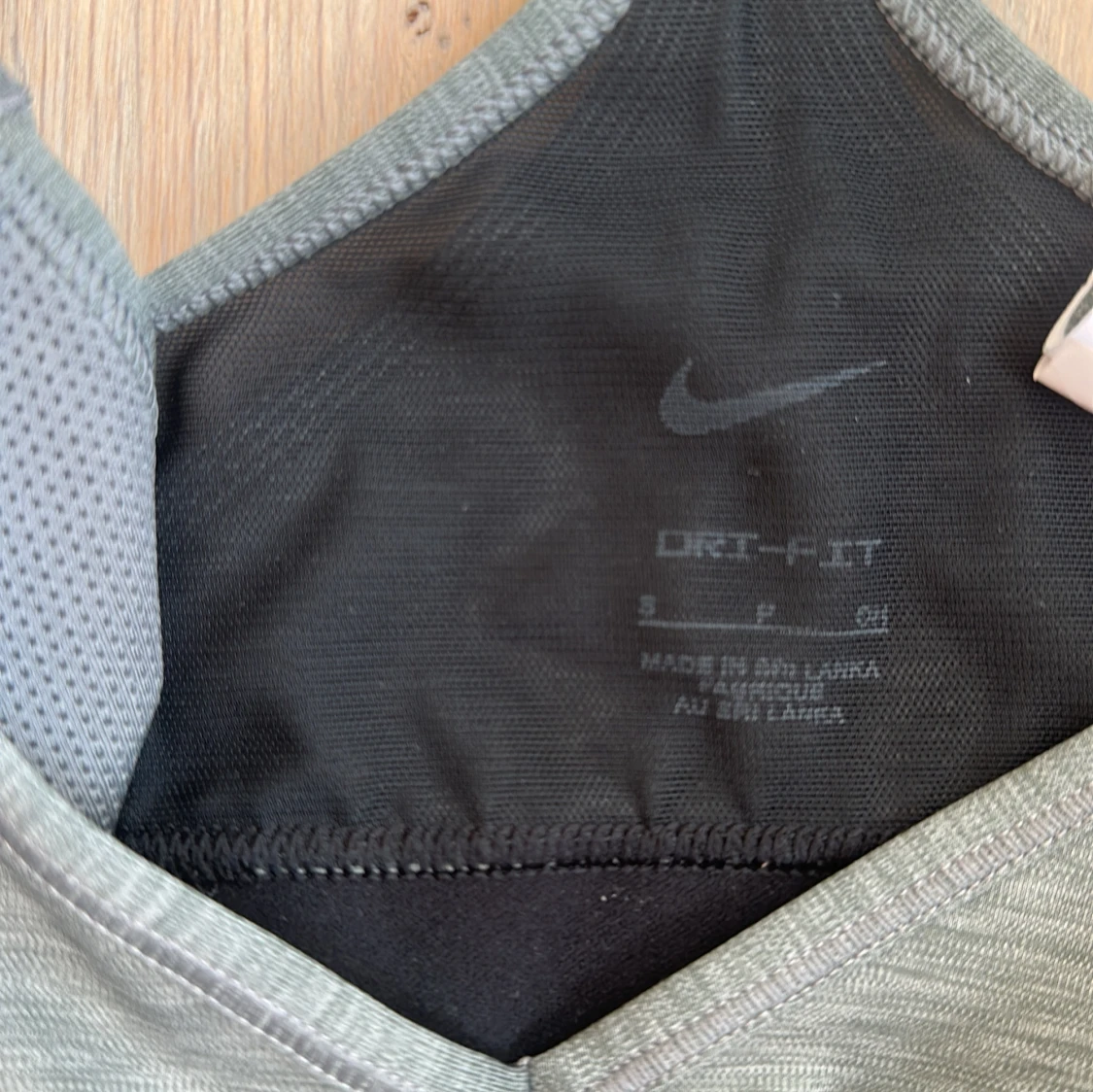 Sportig grå topp från Nike med svarta detaljer och justerbara tunna axelband. Tillverkad i Dri-FIT-material som andas och håller dig torr under träningen. Snygg V-ringning och bred svart resår nedtill för extra stöd. Perfekt för gymmet eller löprundan.