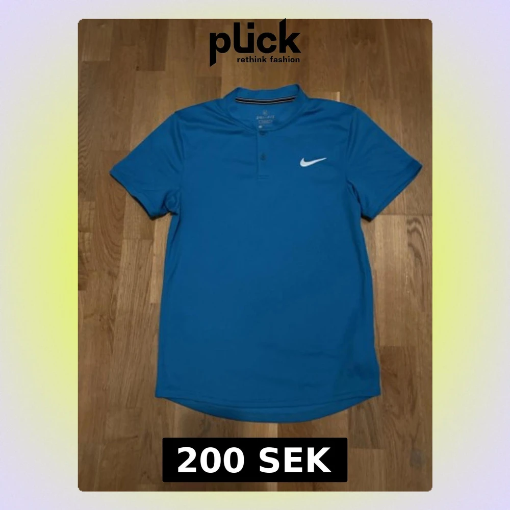 Säljer en blå polotopp från Nike med klassisk vit logga på bröstet. Toppen har korta ärmar, knappslå vid halsen och är gjord i ett lätt och funktionellt polyestermaterial som andas. Perfekt för träning eller sportiga dagar.