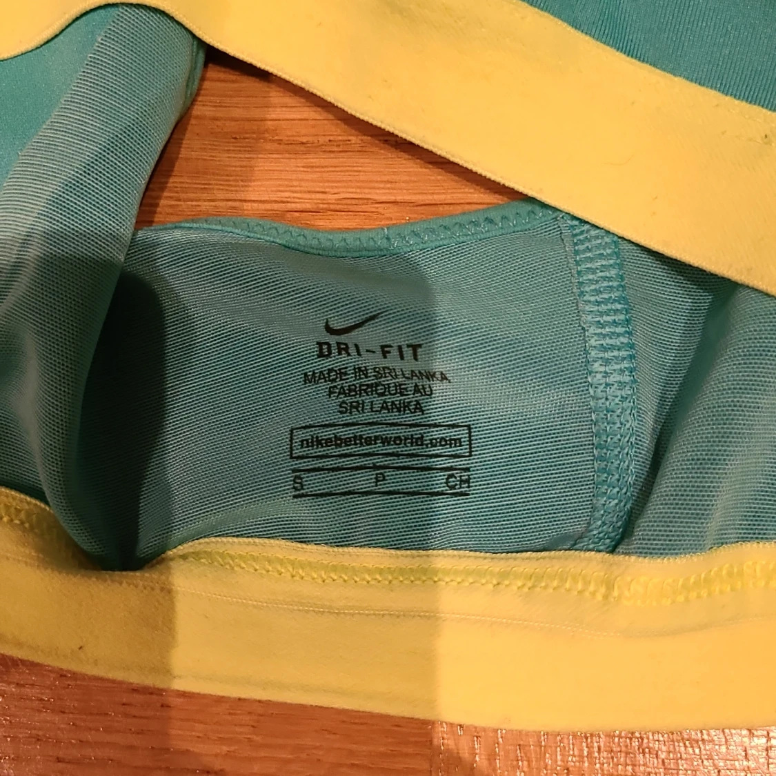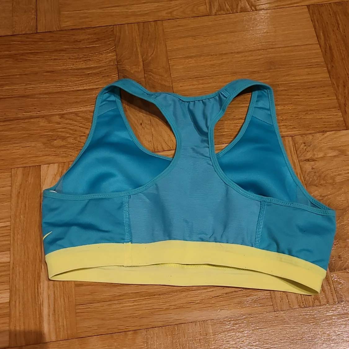 Nike sport-bh i turkos med ljusgul resårkant. Modellen har brottarrygg och är tillverkad i Dri-Fit material som andas och transporterar bort fukt. Perfekt för träning och aktiva dagar. Snygg och sportig look med diskret Nike-logga framtill.