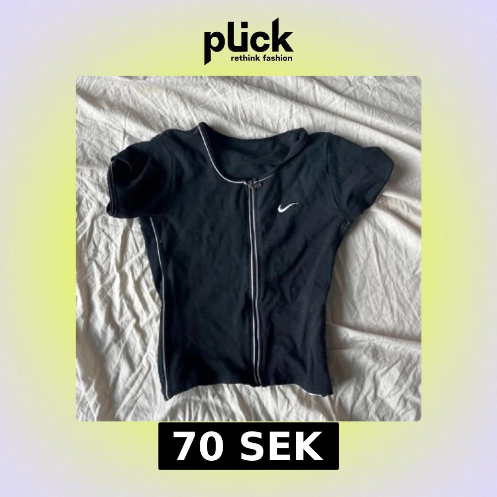 Säljer en svart kortärmad topp från Nike med dragkedja framtill och vit piping längs kanterna. Perfekt för en sportig look eller avslappnad stil. Nike-loggan är diskret placerad på bröstet.