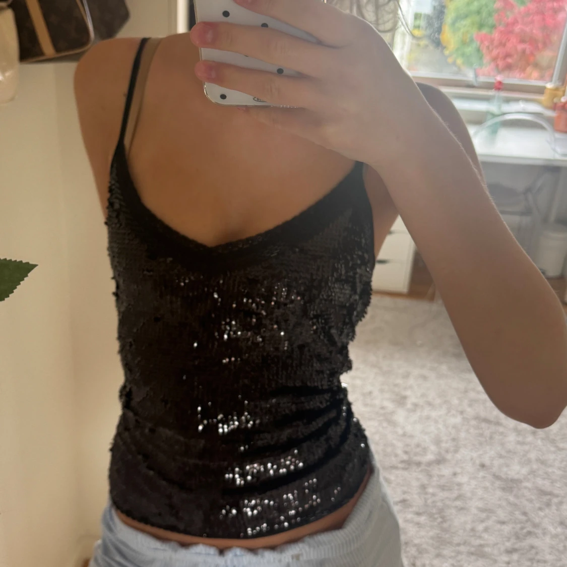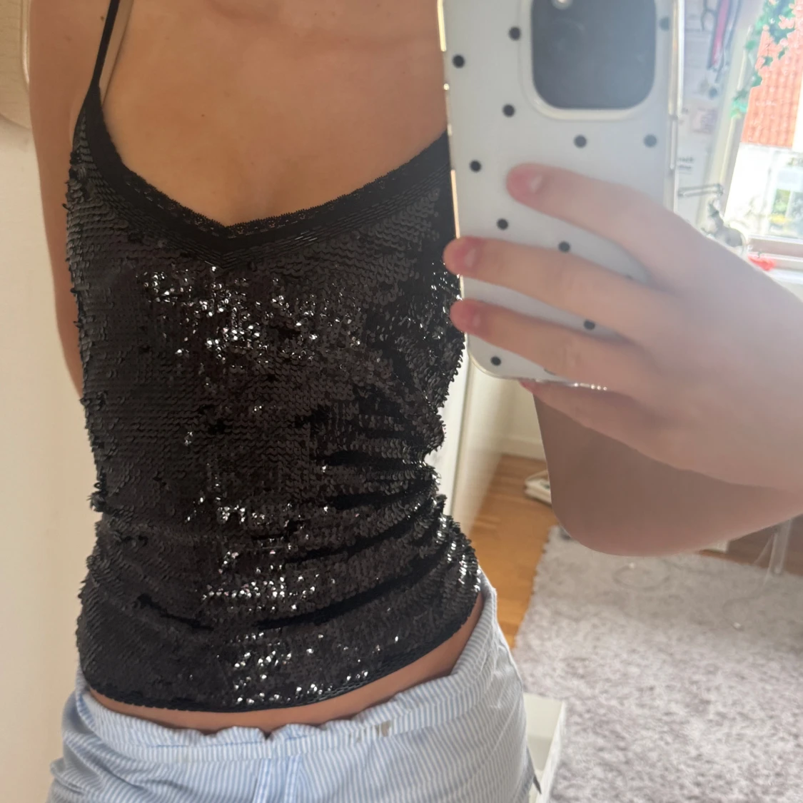 Säljer ett svart linne med smala axelband och v-ringning, täckt av glittrande paljetter. Toppen har en figurnära passform och är strechig så passar xs-m