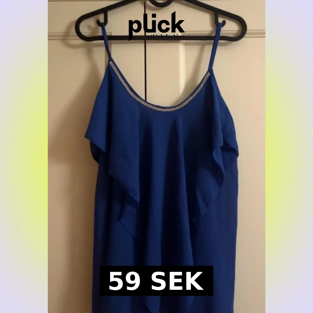 Snygg blå linnetopp med tunna axelband och diamantdetaljer längs halsringningen. Toppen har ett flowigt fall med volang framtill som ger en cool och feminin vibe. Perfekt för dig som vill sticka ut med lite extra bling och färg.