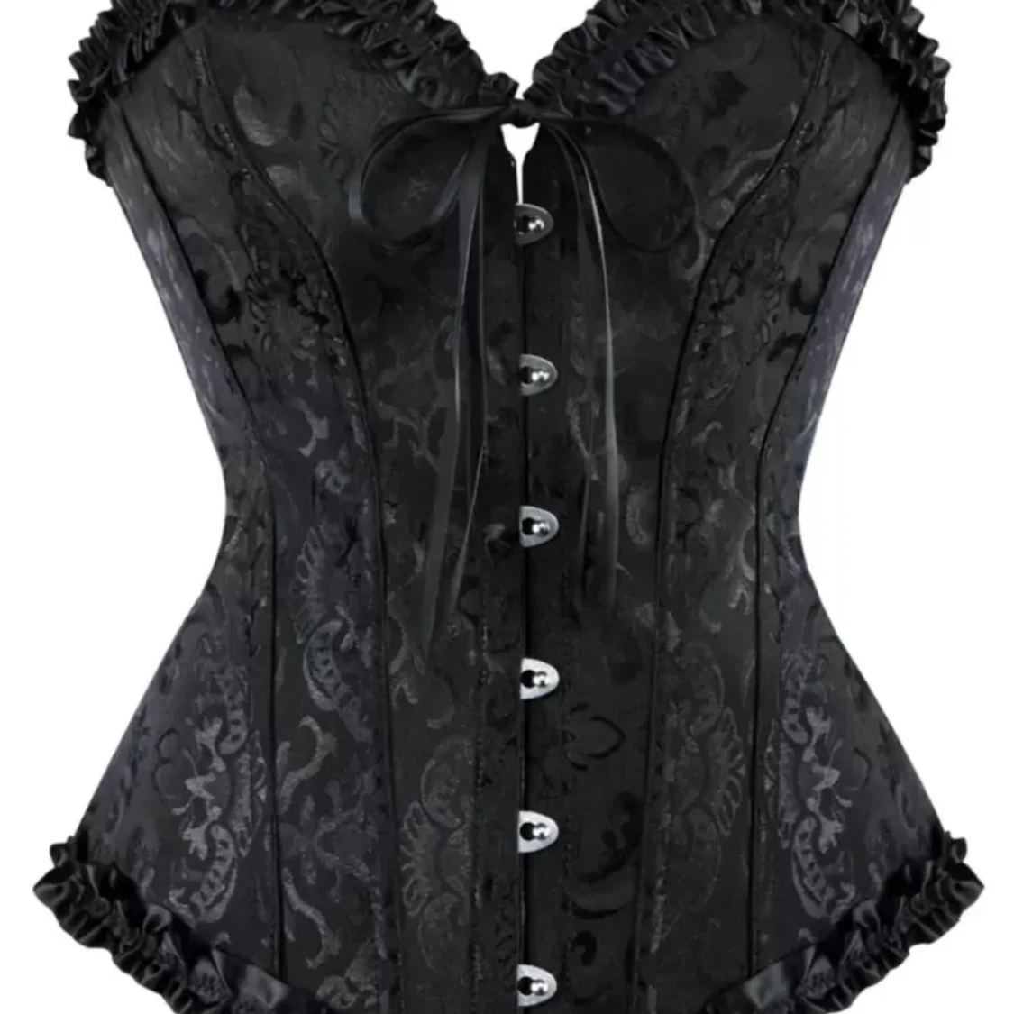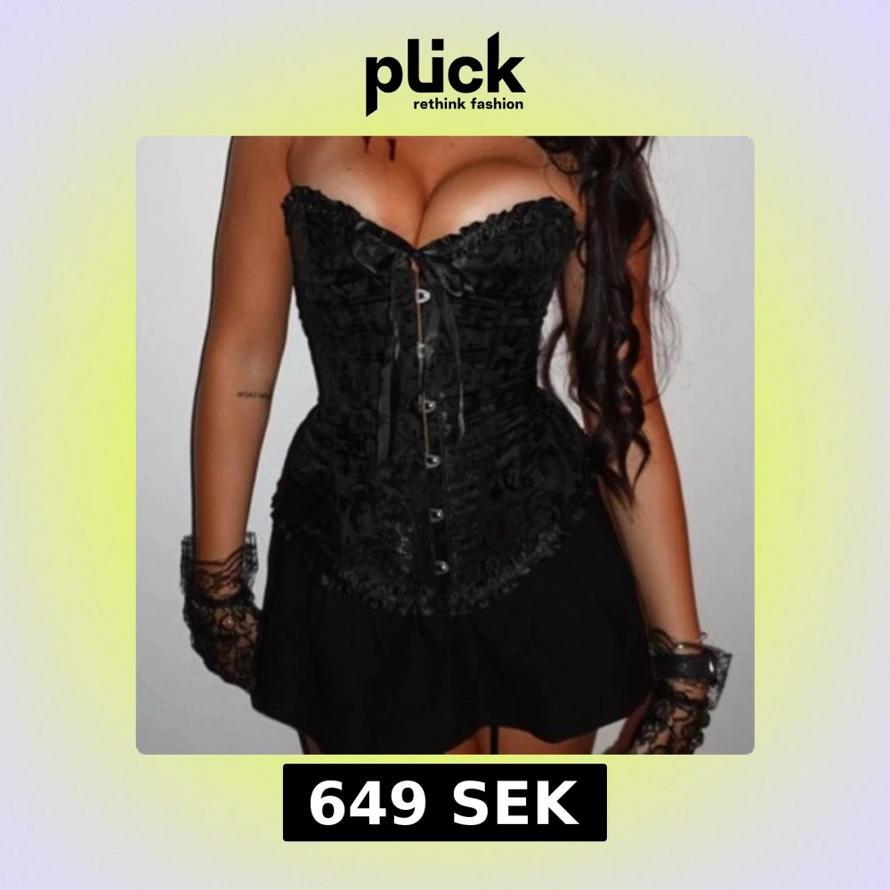 Säljer en svart korsett med snyggt broderat mönster och glansig finish. Toppen har snörning i ryggen, rosett framtill och dekorativa knappar. Volangkant upptill och nedtill ger en extra touch. Perfekt för dig som vill ha en edgy och cool look.