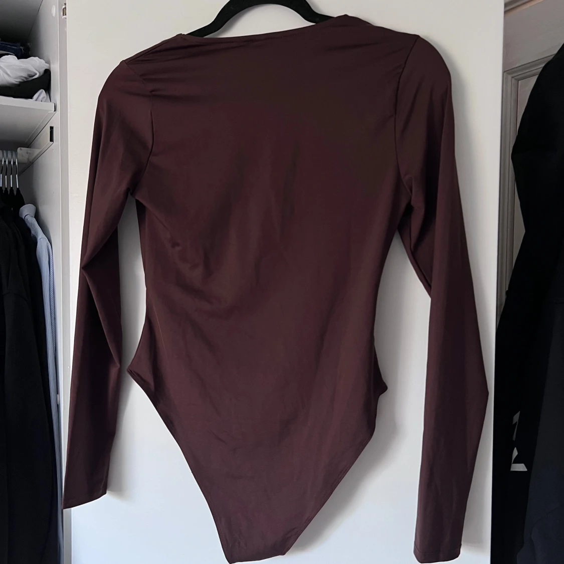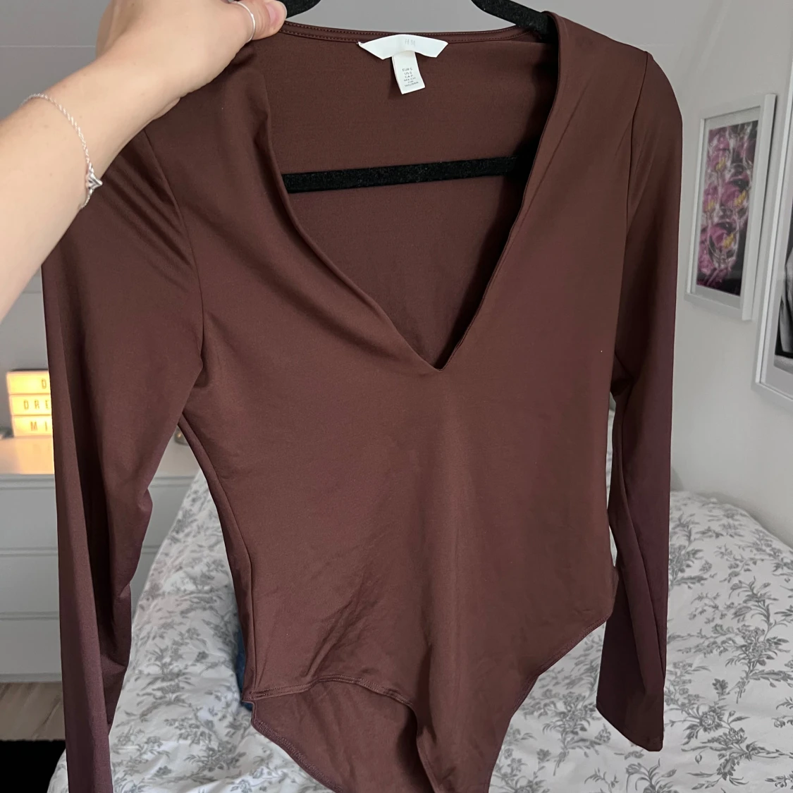 Säljer en stilren brun bodysuit från H&M med lång ärm och v-ringning. Perfekt för att matcha med både jeans och kjol. Materialet är mjukt och stretchigt för en bekväm passform. Aldrig använd 🤎 Önskar du veta exakta mått? Tveka inte att höra av dig!