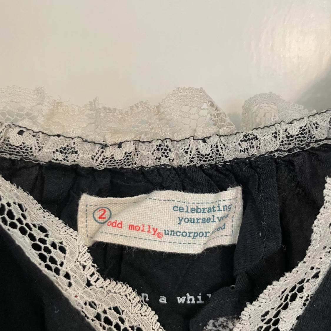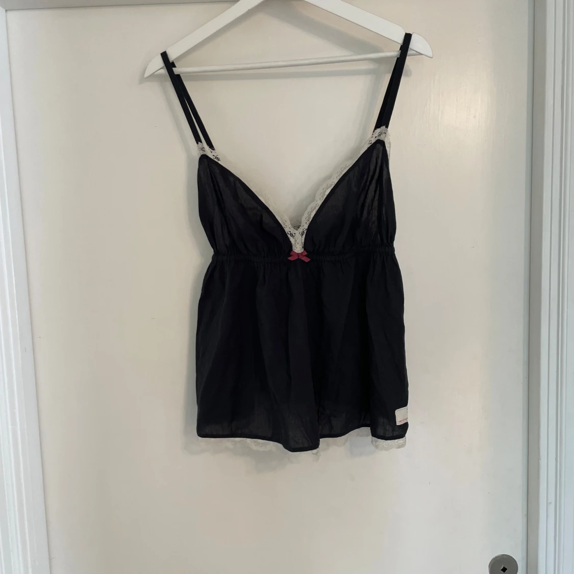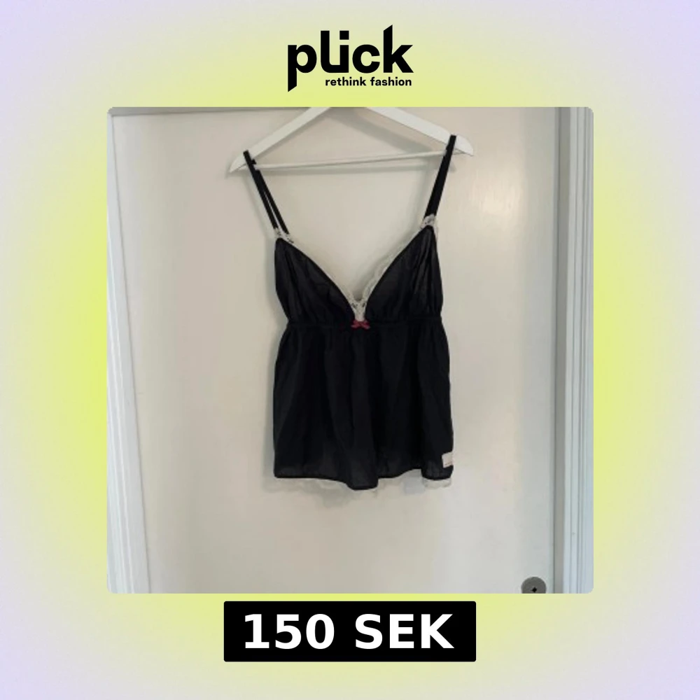 Supersöt svart linnetopp från Odd Molly med tunna axelband, vit spetskant och liten rosa rosett framtill. Toppen har v-ringning och en broderad detalj på ryggen. Perfekt för dig som gillar romantiska och feminina detaljer.
