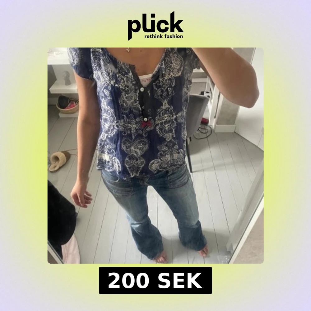 (Priset kan sänkas) Säljer en blå blus med vitt paisleymönster, korta ärmar och v-ringad hals. Blusen har dekorativa knappar framtill, svart spetskant och en liten röd rosett. Materialet känns lätt och luftigt, perfekt för varmare dagar.