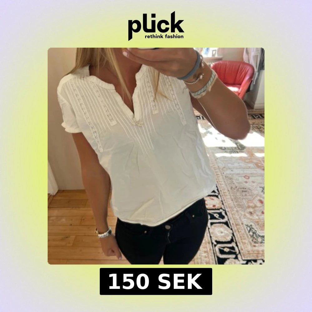 Söt vit blus med korta ärmar och fina spetsdetaljer längs bröstet. Blusen har en liten v-ringning med dekorativ knytning och tunna veck framtill. Perfekt för en fräsch och somrig look, lätt att matcha med jeans eller kjol.💛