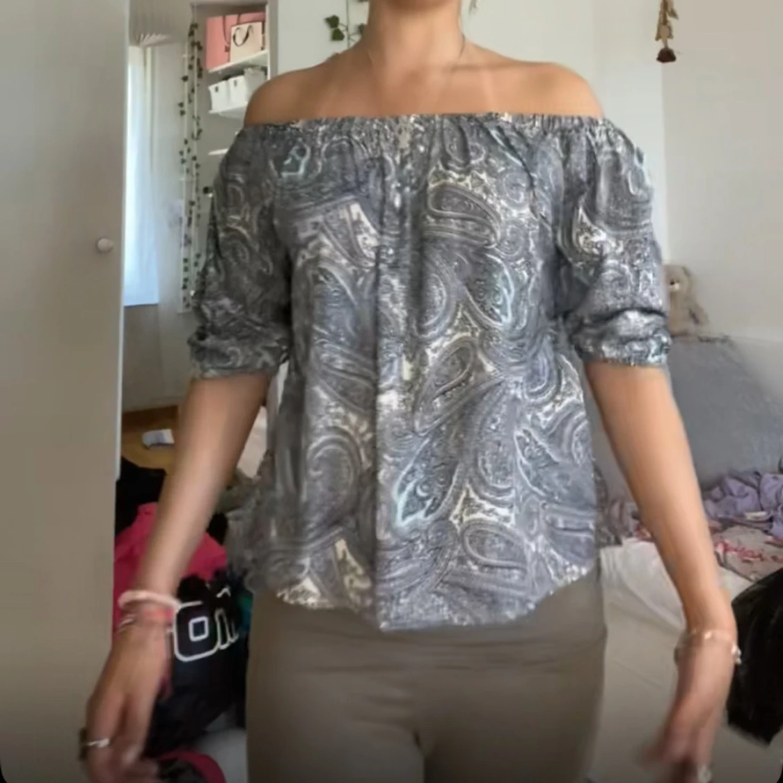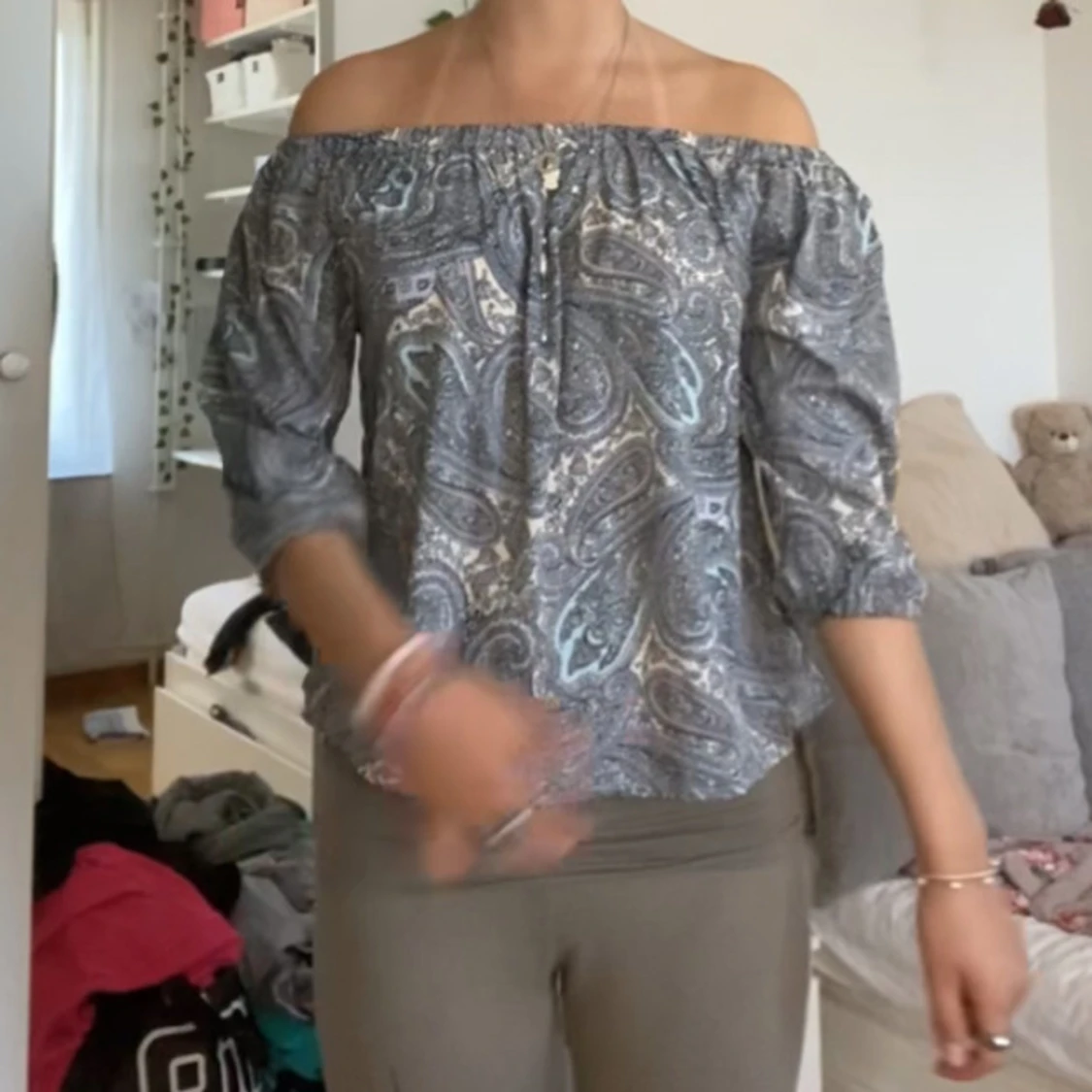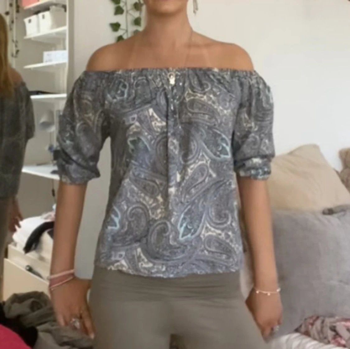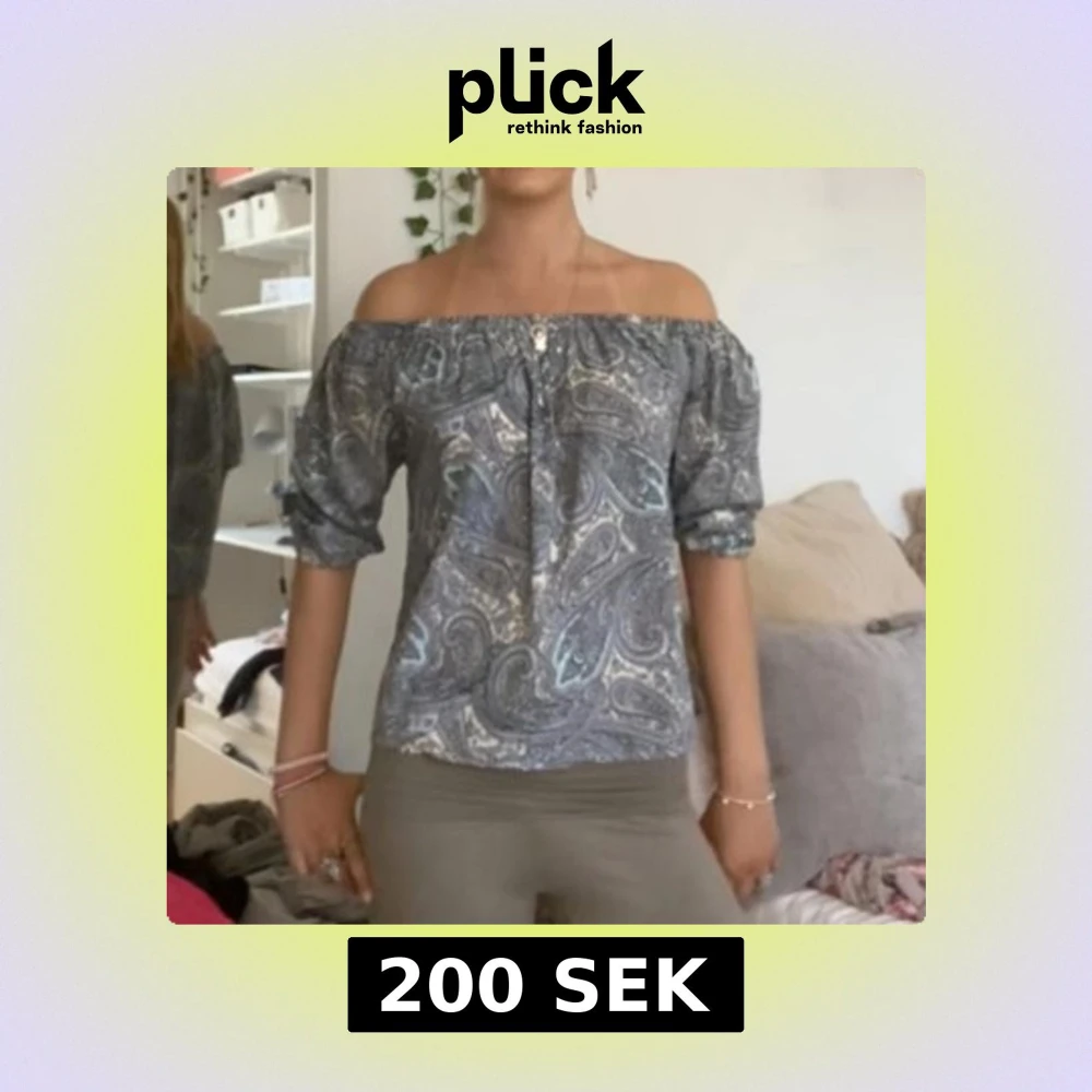 Säljer en snygg offshoulder blus med blått och grått paisleymönster. Blusen har trekvartsärmar och resår upptill för en bekväm passform. Perfekt för dig som vill ha en trendig och luftig topp.