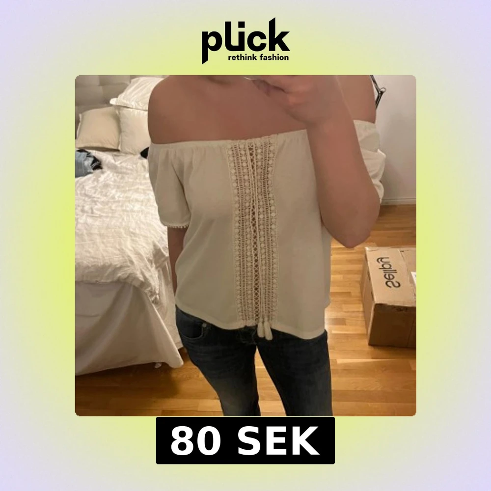 Superfin vit offshoulder blus med korta ärmar och dekorativa spetsdetaljer framtill. Blusen har knytband med tofsar och små bollar längs ärmsluten. Knappt använd. Kan ha både som offshoulder eller vanlig T-shirt stil