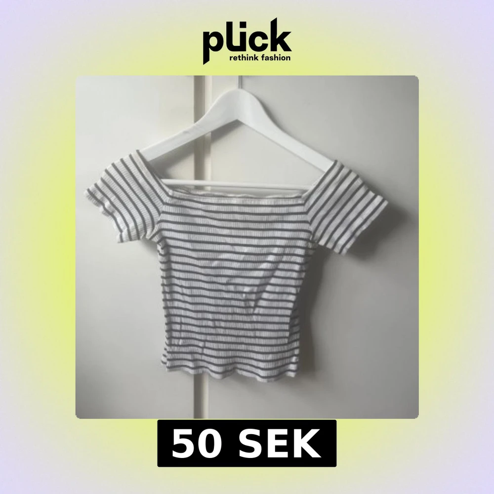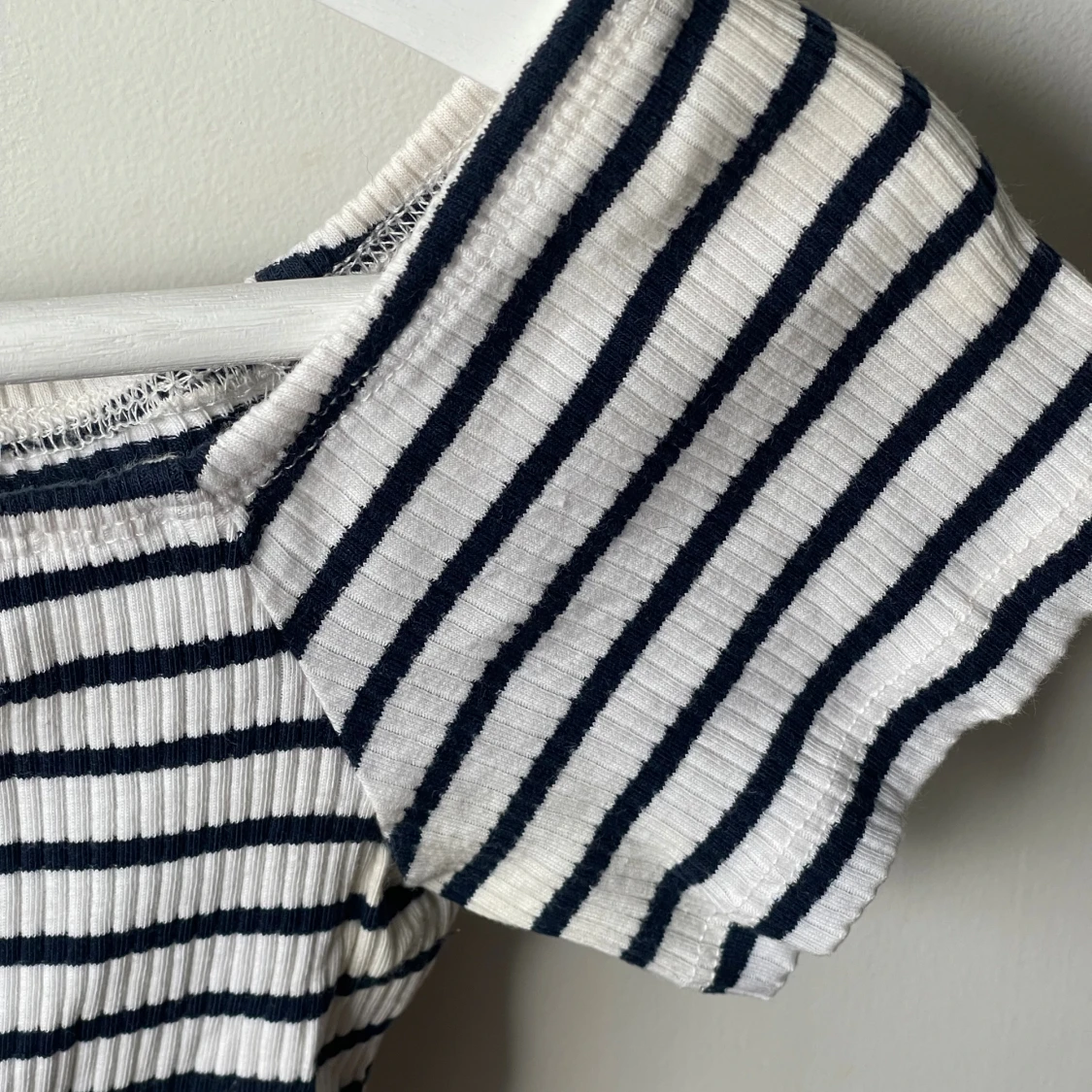 Säljer en vit och marinblå randig topp med ribbad struktur. Modellen är offshoulder med korta ärmar och croppad passform. Inte helt säker på storlek men skulle säga xs🥰