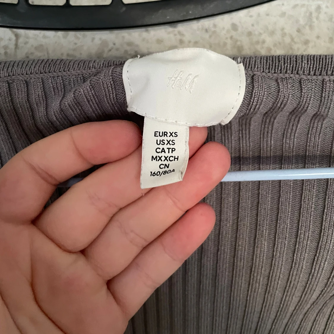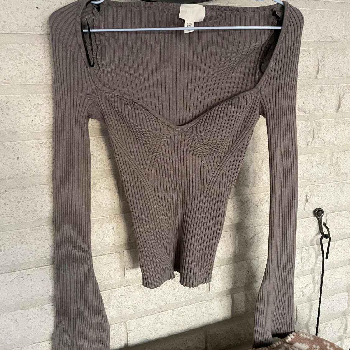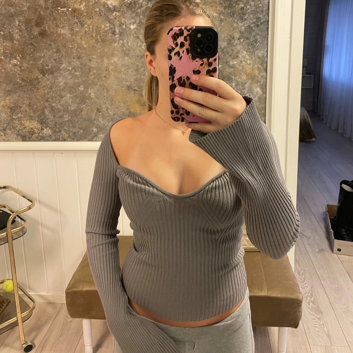 Säljer en grå ribbad offshoulder topp från H&M i storlek XS. Toppen har lång ärm, markerad byst och figurnära passform. Materialet är stretchigt och mjukt, perfekt för en trendig look. Snyggt v-ringad framtill och sitter tajt över kroppen.