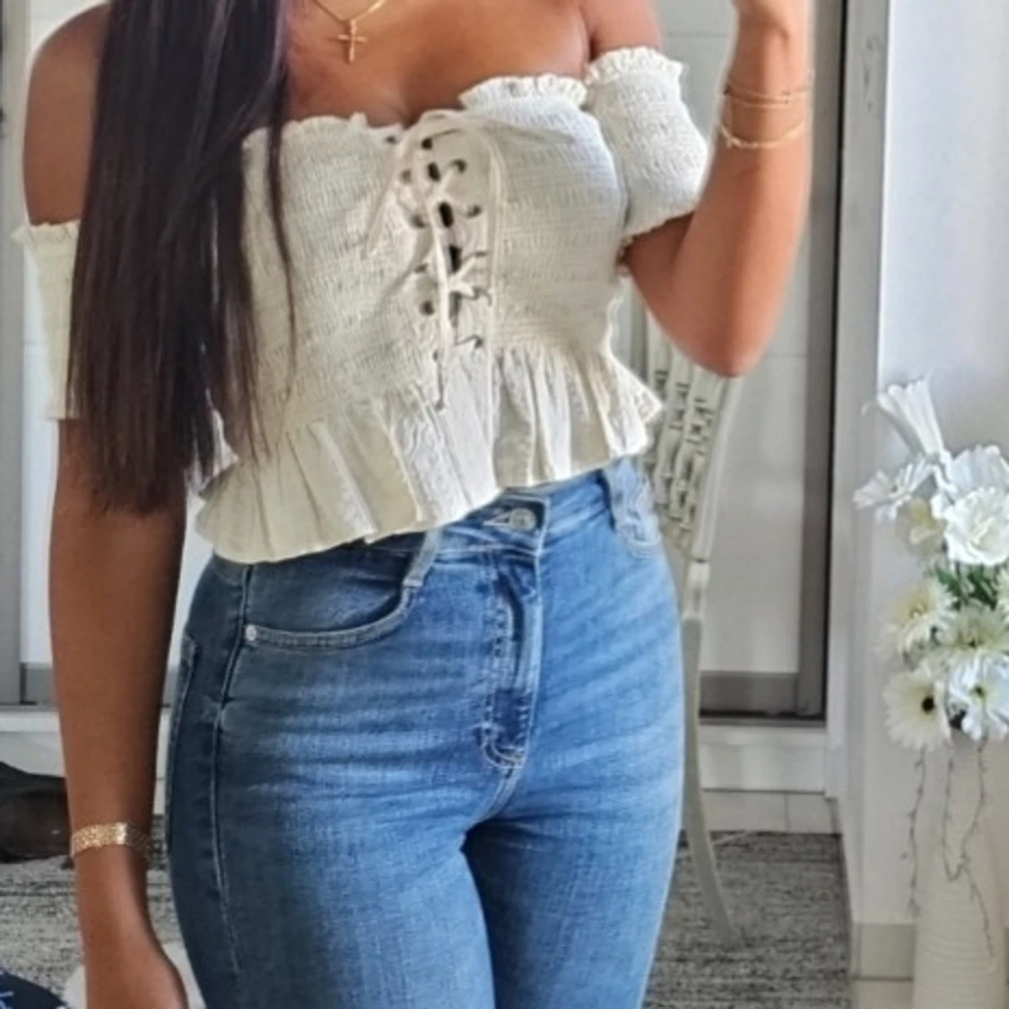 Supersöt offshoulder topp i vitt med smockad överdel, snörning framtill och volangkant nertill. Croppad modell som sitter tajt över bysten och har korta ärmar. Perfekt till höga jeans för en trendig look.