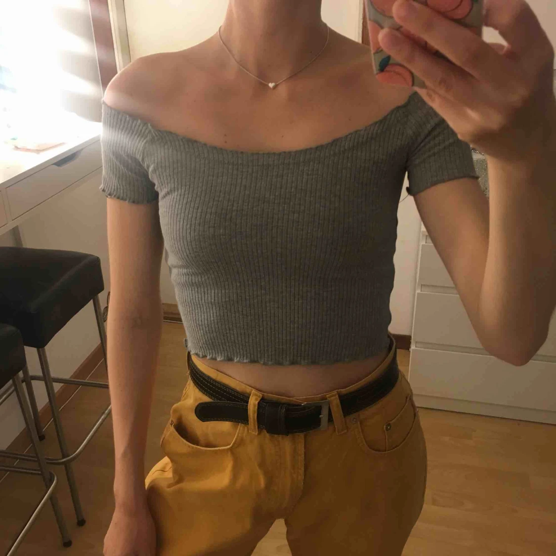 Offshoulder ribbad topp med pärlor - Säljer en superfin offshoulder topp i cremevitt med ribbad struktur. Toppen har långa ärmar och en snygg pärldetalj längs urringningen som ger en extra touch. Materialet känns mjukt och stretchigt. Helt ny och oanvänd med prislapp på.