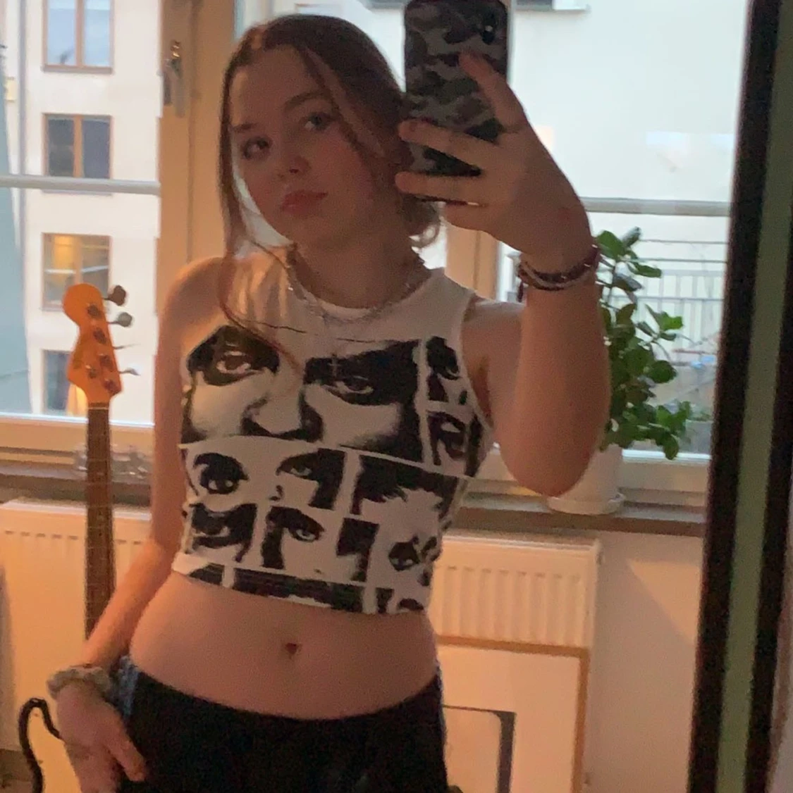 Den här vita crop topen har olika ögon på o där bak är e den ba helt vit, skit nice o bra material💋