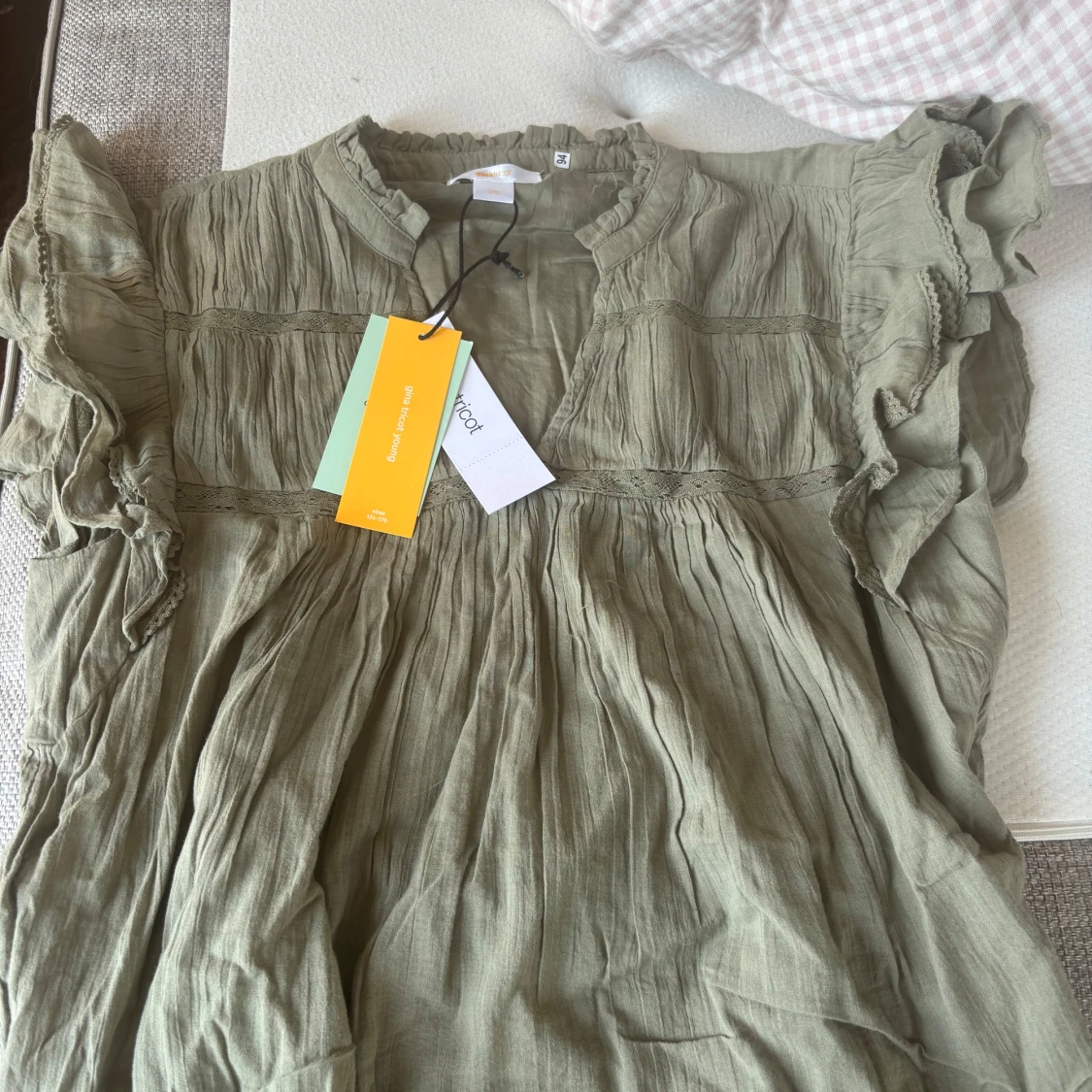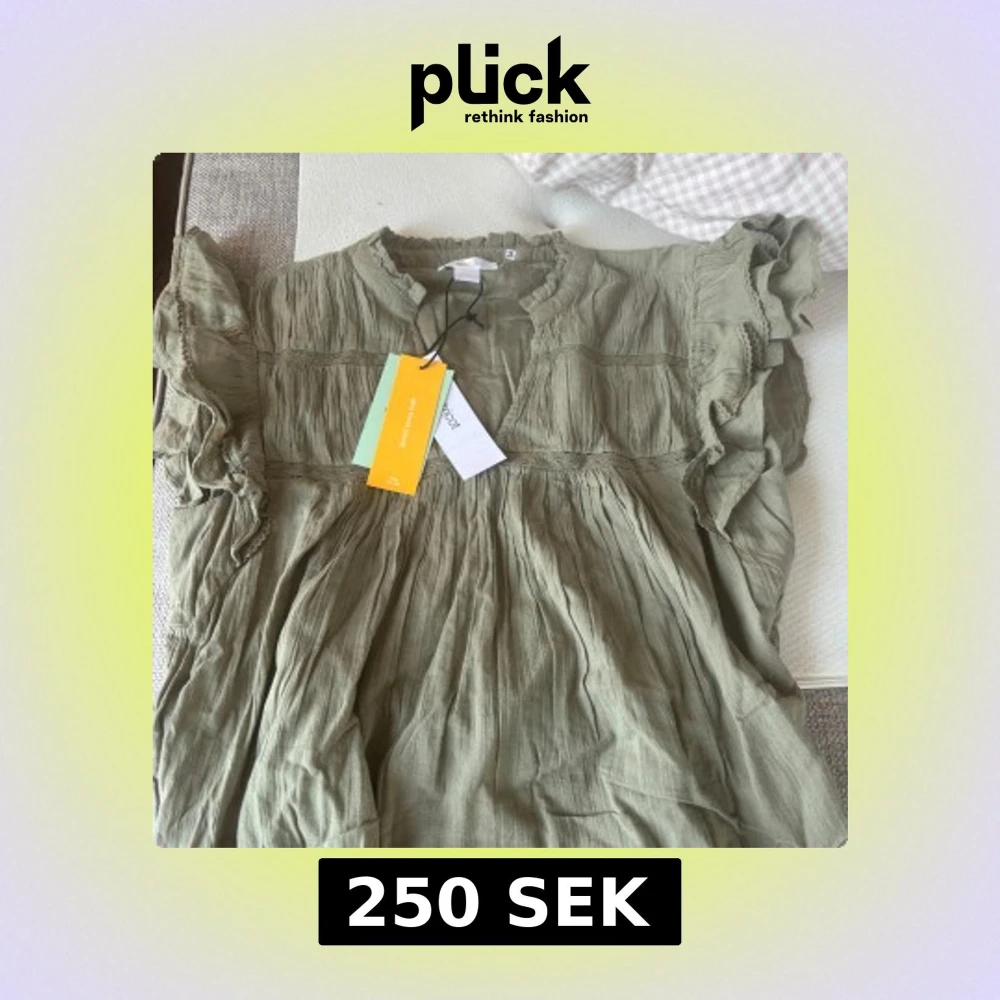 Supersöt olivgrön blus från Gina Tricot med volangärmar och lätt rynkad struktur. Blusen har v-ringning och fina spetsdetaljer längs med sömmarna. Luftig och flowy passform, perfekt för varmare dagar.❤️🙌