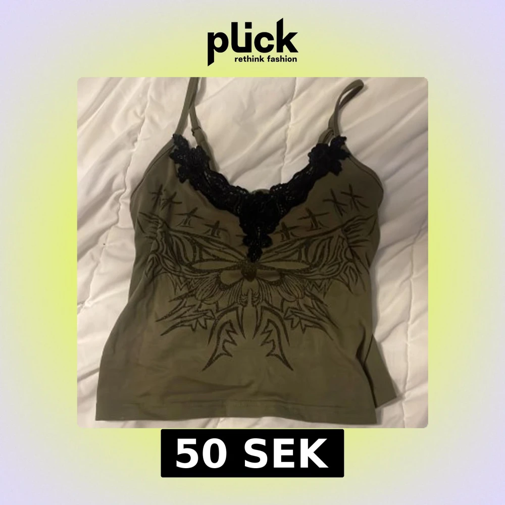 Snygg olivgrön linnetopp med smala axelband och svart spets längs v-ringningen. Framsidan har ett coolt svart tryck med fjärilsmotiv och grafiska detaljer. Toppen är figurnära och har justerbara axelband för perfekt passform.