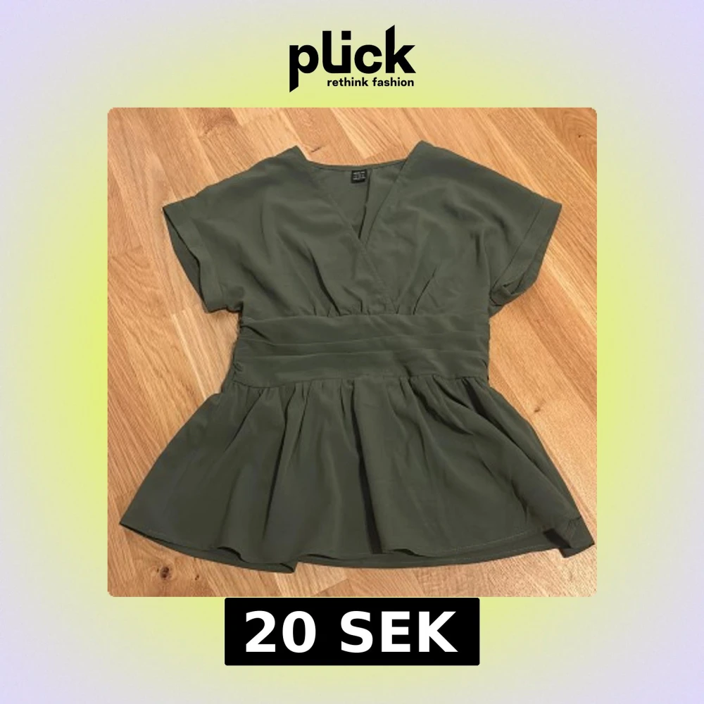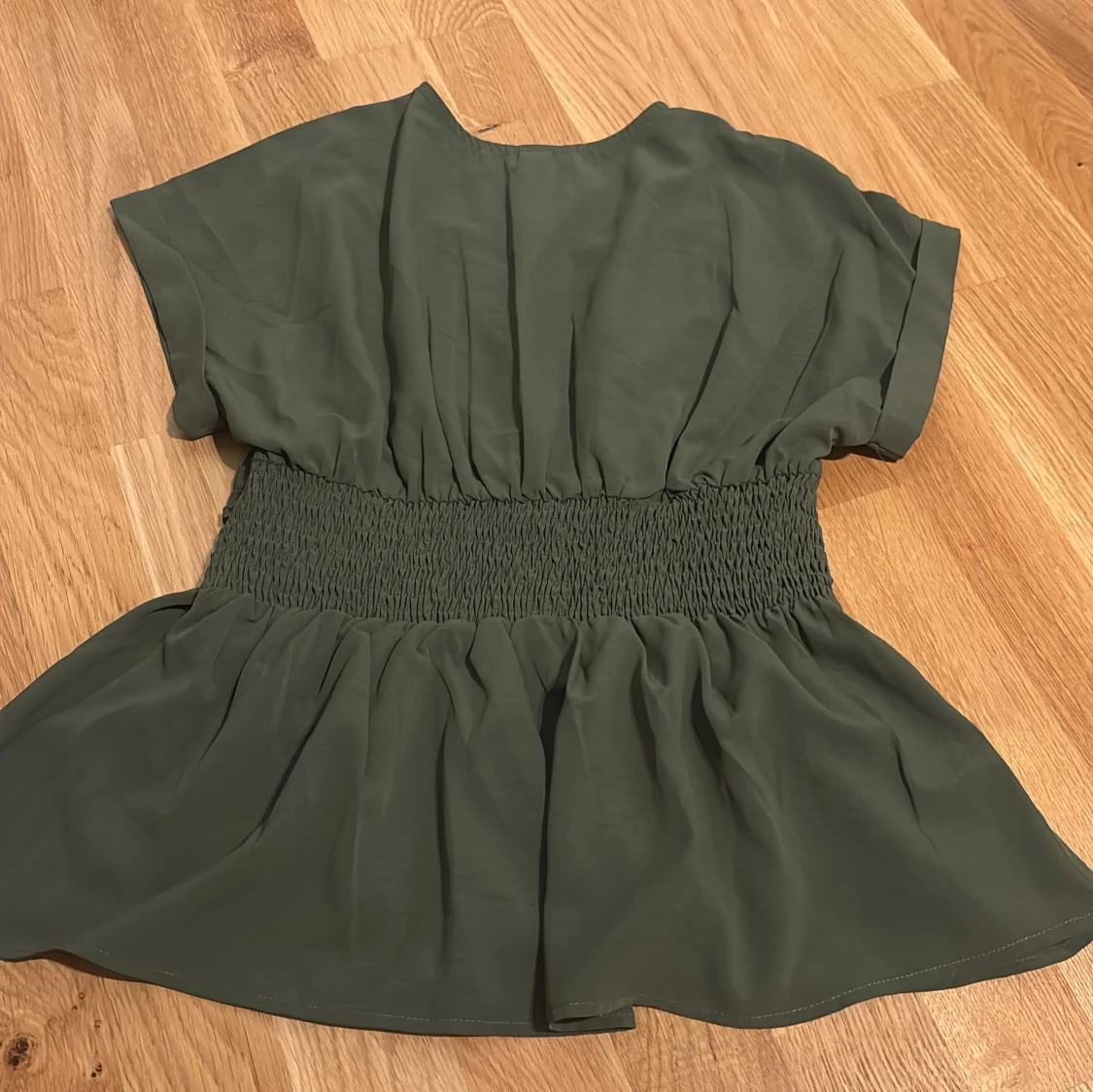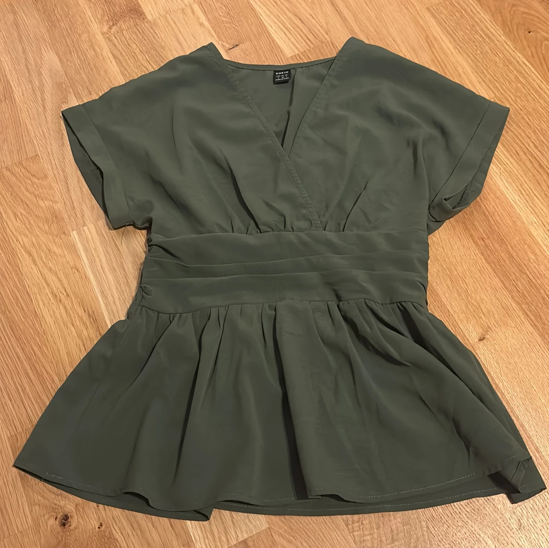 Säljer en olivgrön blus med v-ringning och omlottkänsla framtill. Toppen har korta ärmar, markerad midja med rynk och smock baktill samt ett lätt utsvängd nederdel. Perfekt för dig som gillar en feminin och avslappnad stil.