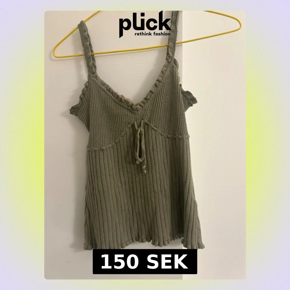 Supersöt olivgrön linnetopp med ribbad struktur och volangkant. Toppen har smala axelband, dekorativ knytning framtill och en beige spetsdetalj vid v-rigningen.