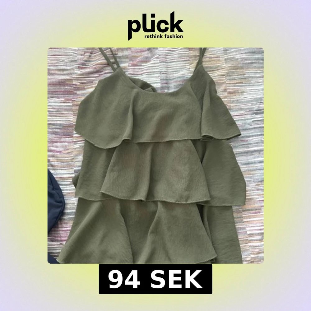 Snygg olivgrön topp med flera lager volanger och smala axelband. Köpt på marknad i Spanien så vet ej vart den är från!! 🤗🤗står inte heller storlek men mellan d och m kan passa vem som helst nästan!!