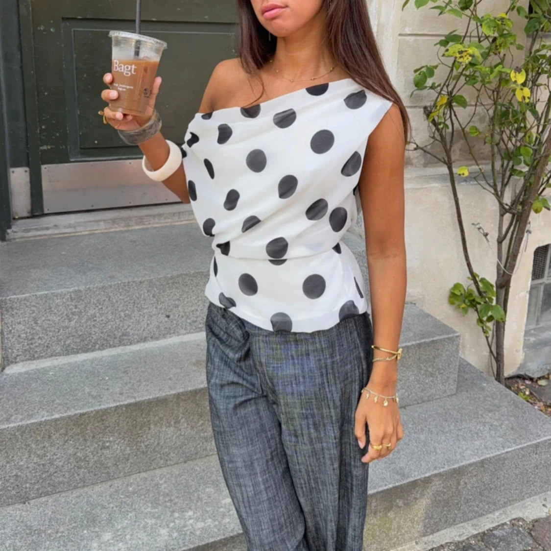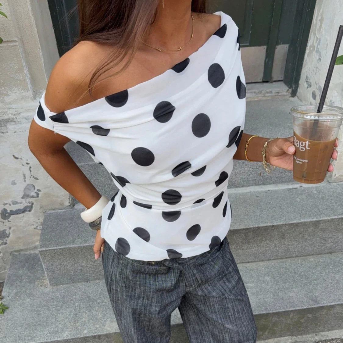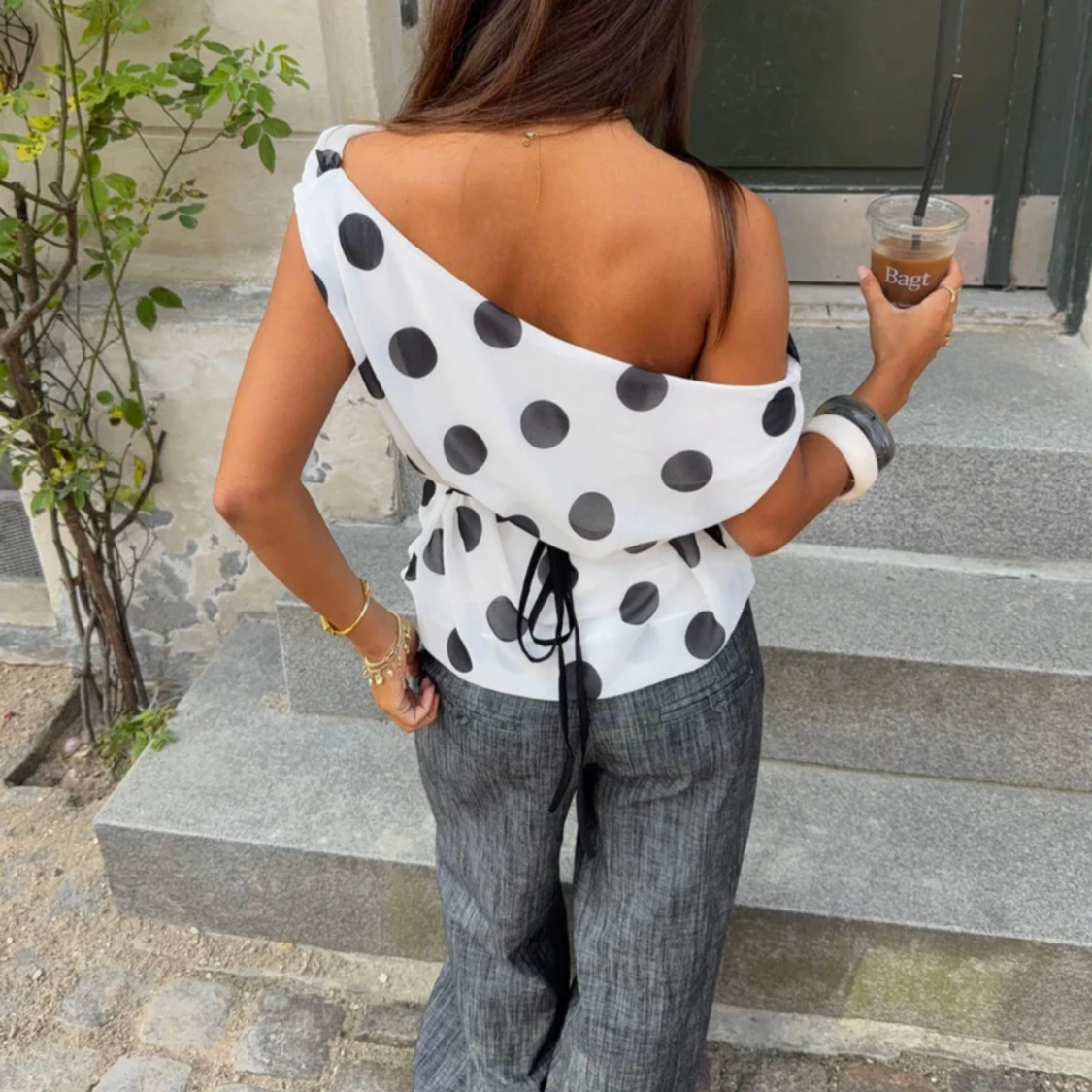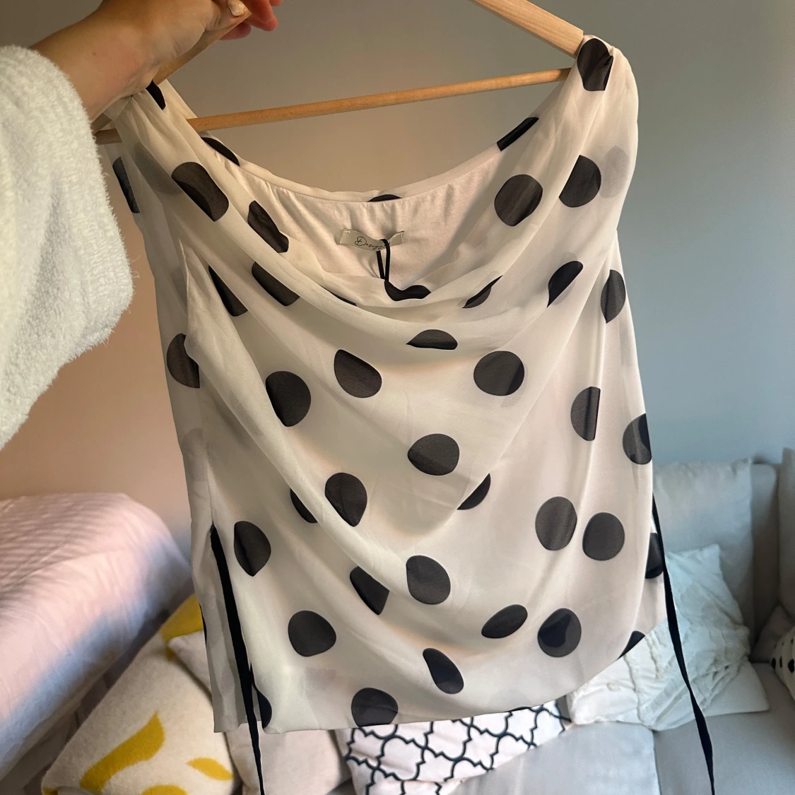 Snygg vit offshoulder topp från DesignBySi med svarta prickar och draperad passform. Toppen har snörning i ryggen för en justerbar look. Oanvänd, köpt förra månaden och storlek M/L 🥰