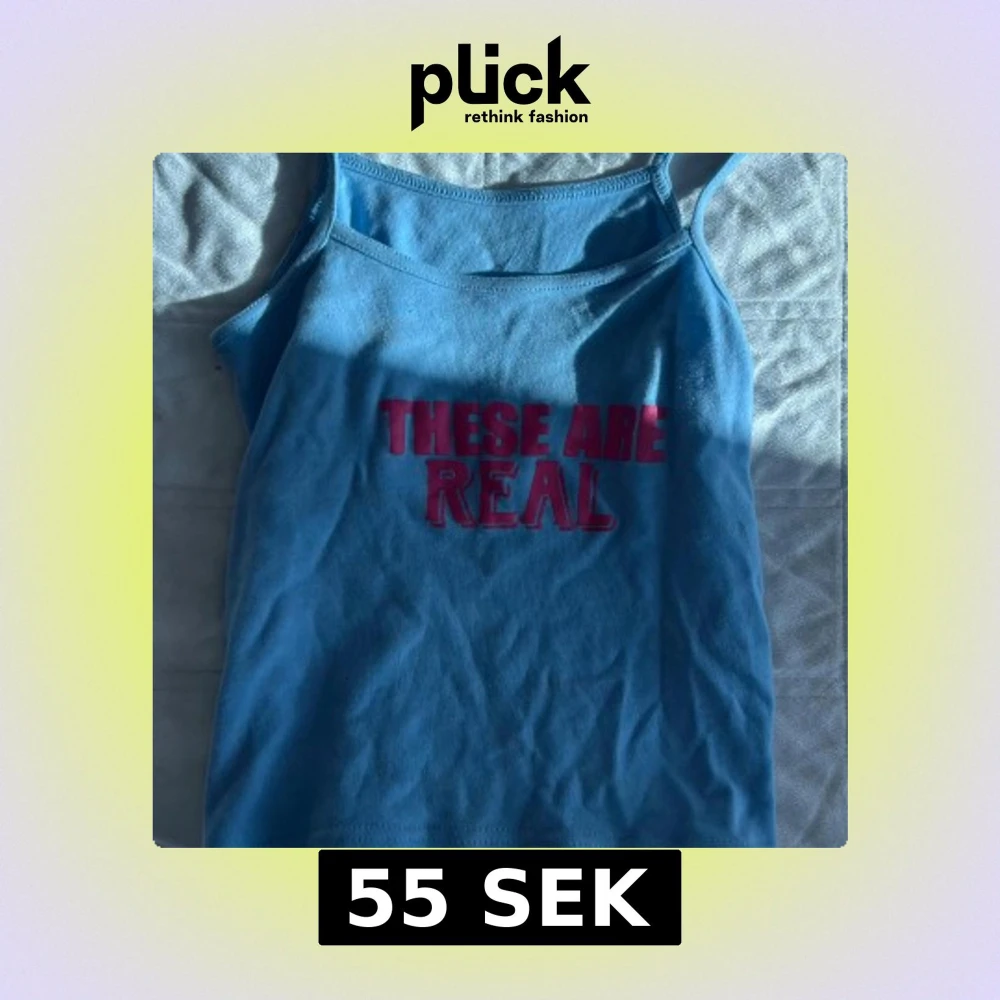 Säljer ett blått linne med tunna axelband och trycket 'THESE ARE REAL' i rosa framtill. Perfekt för dig som vill sticka ut med ett statement-plagg. Skön och lätt att bära under varma dagar.