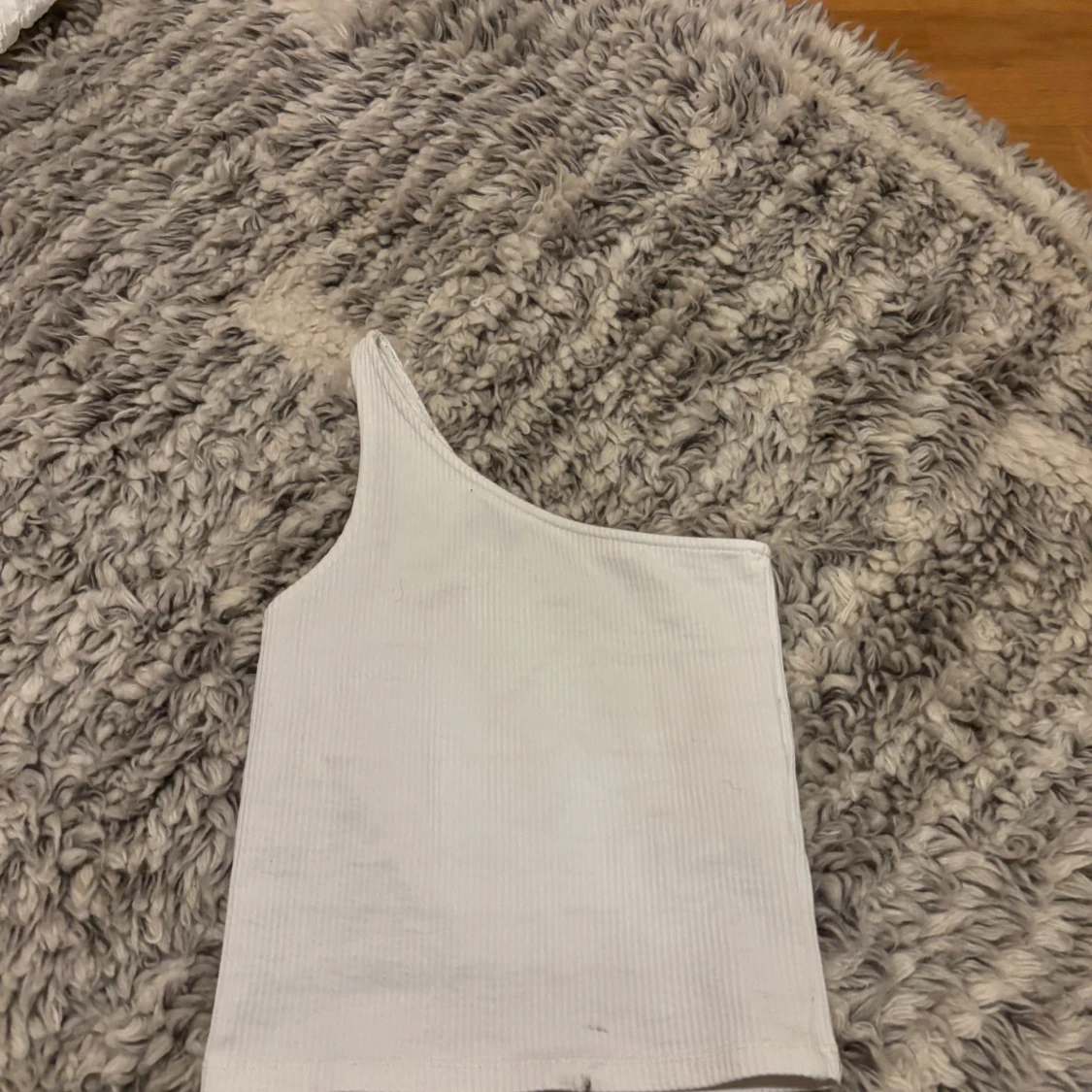 Säljer en stilren vit oneshoulder topp med ribbad struktur. Perfekt för en trendig look. Passar bra till både jeans och kjol. Har liten fläck längst ner som förmodligen går bort i tvätten❤️
