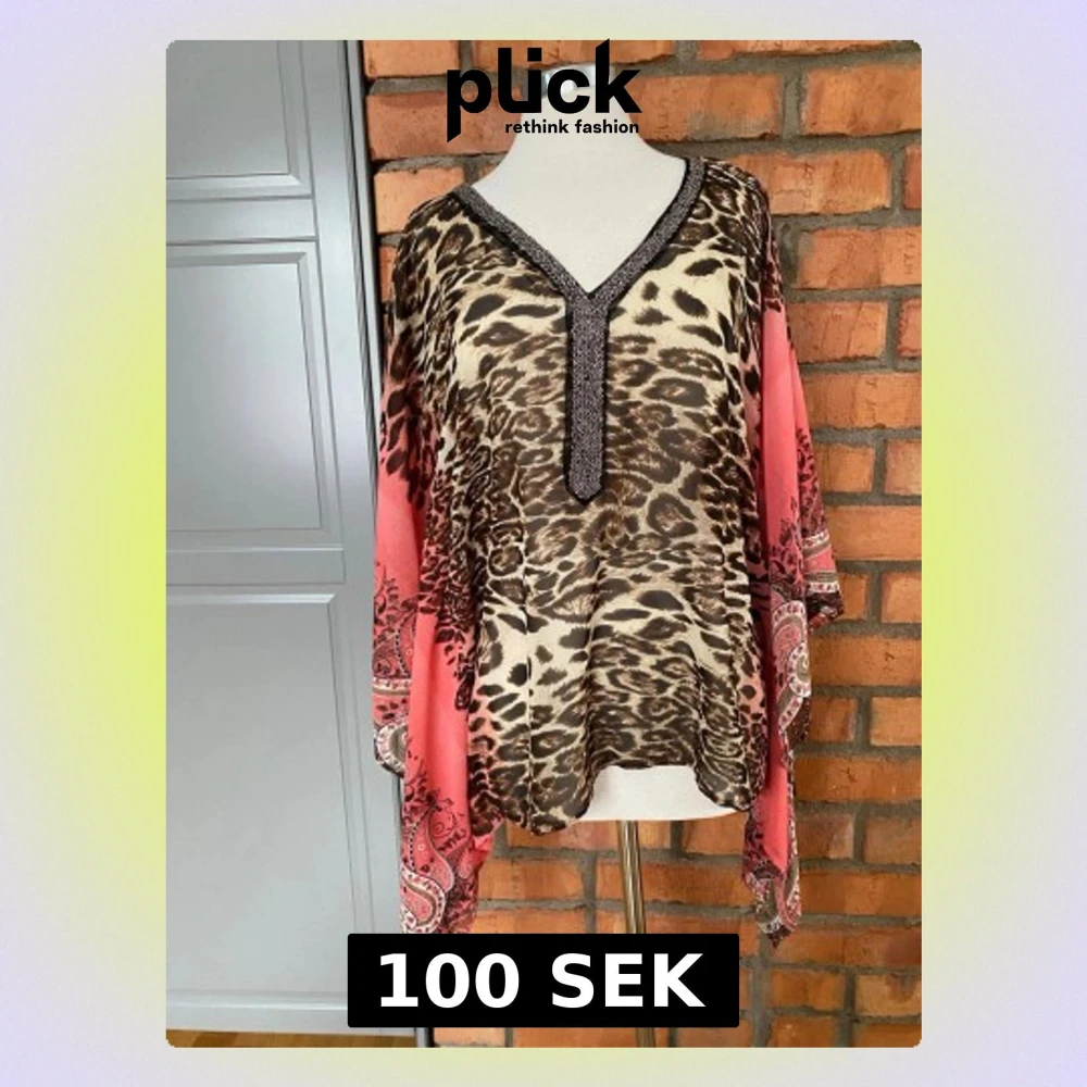 Säljer en luftig blus med leopardmönster i beige och brunt, samt rosa paisleydetaljer på ärmarna. Blusen har v-ringning med dekorativa pärlor längs kanten och vida, trekvartsärmar. Perfekt för dig som vill sticka ut med ett djurmönster och coola detaljer.