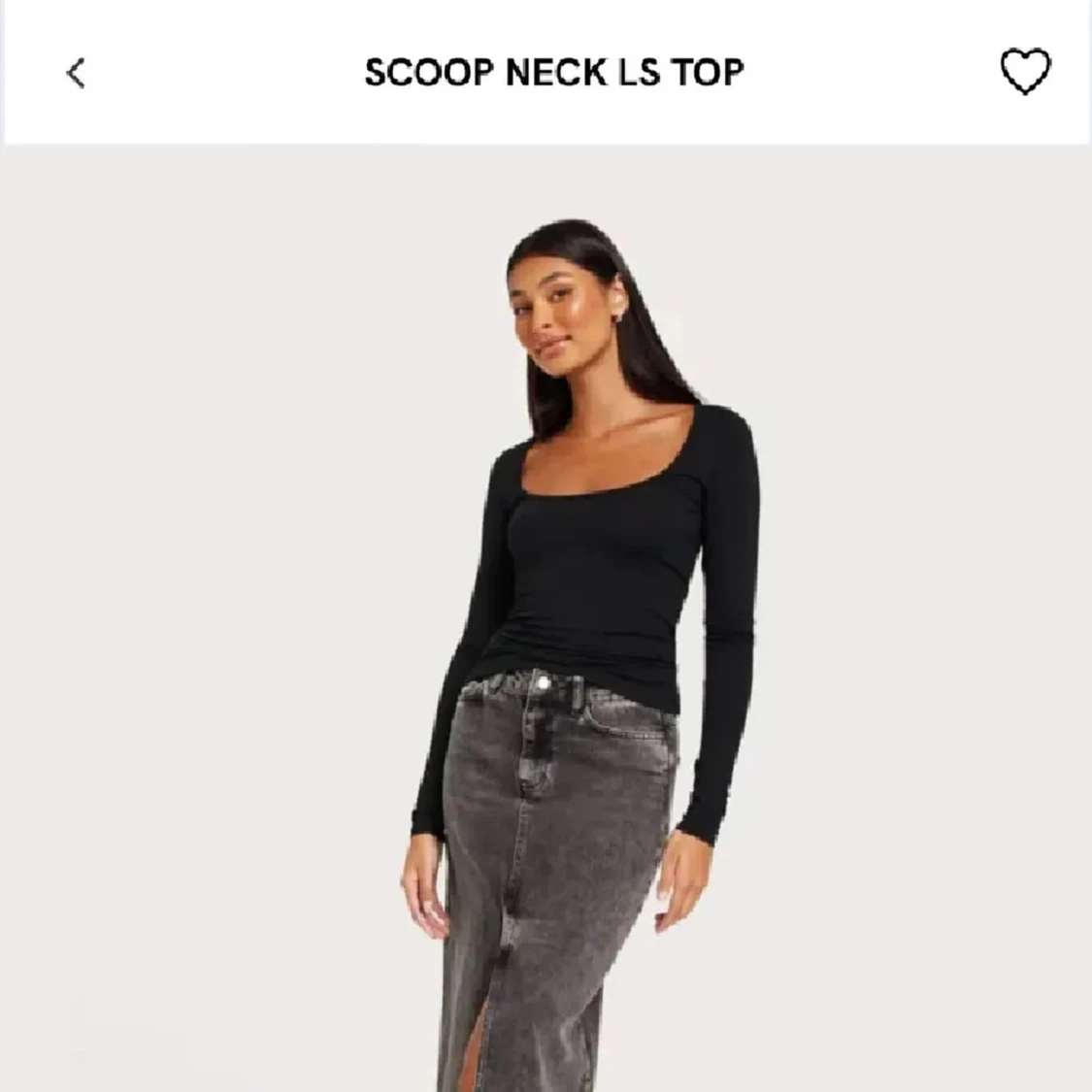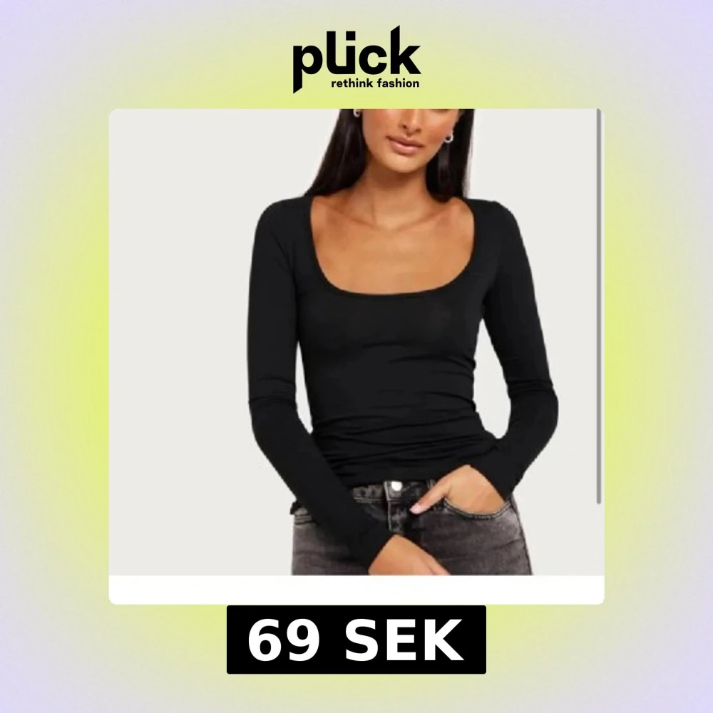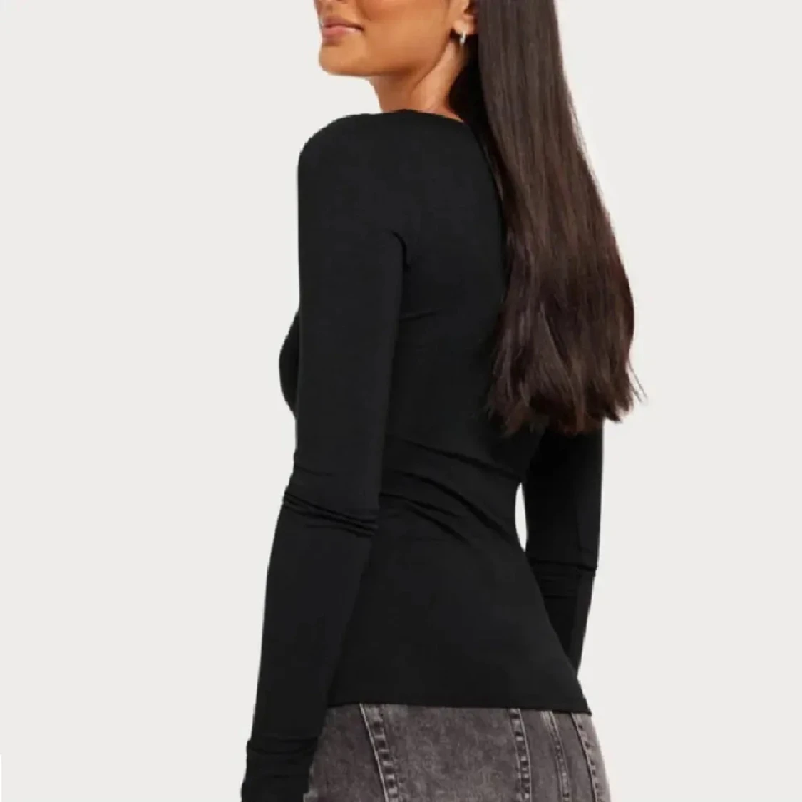 Snygg svart långärmad topp med djup fyrkantig ringning och tight passform. Perfekt att styla med jeans eller kjol för en clean look. Tunn och stretchig, vilket gör den superbekväm och enkel att bära hela dagen.
