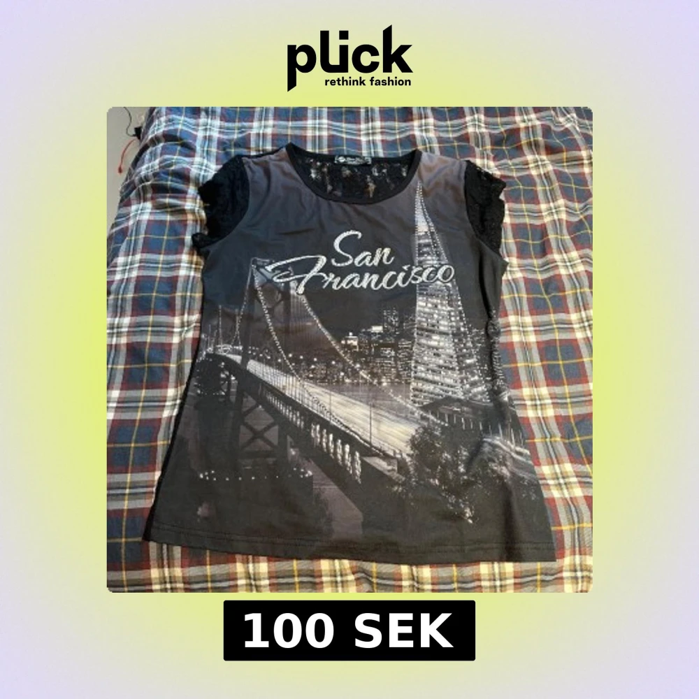 Svart topp från Favor Fashion i storlek XL men sitter som s med genomskinlig spets och korta ärmar. Framsidan har ett tryck med San Francisco och stadssilhuett i svartvitt, medan baksidan är helspets med blommigt mönster. Perfekt för dig som gillar statement-plagg och coola detaljer.