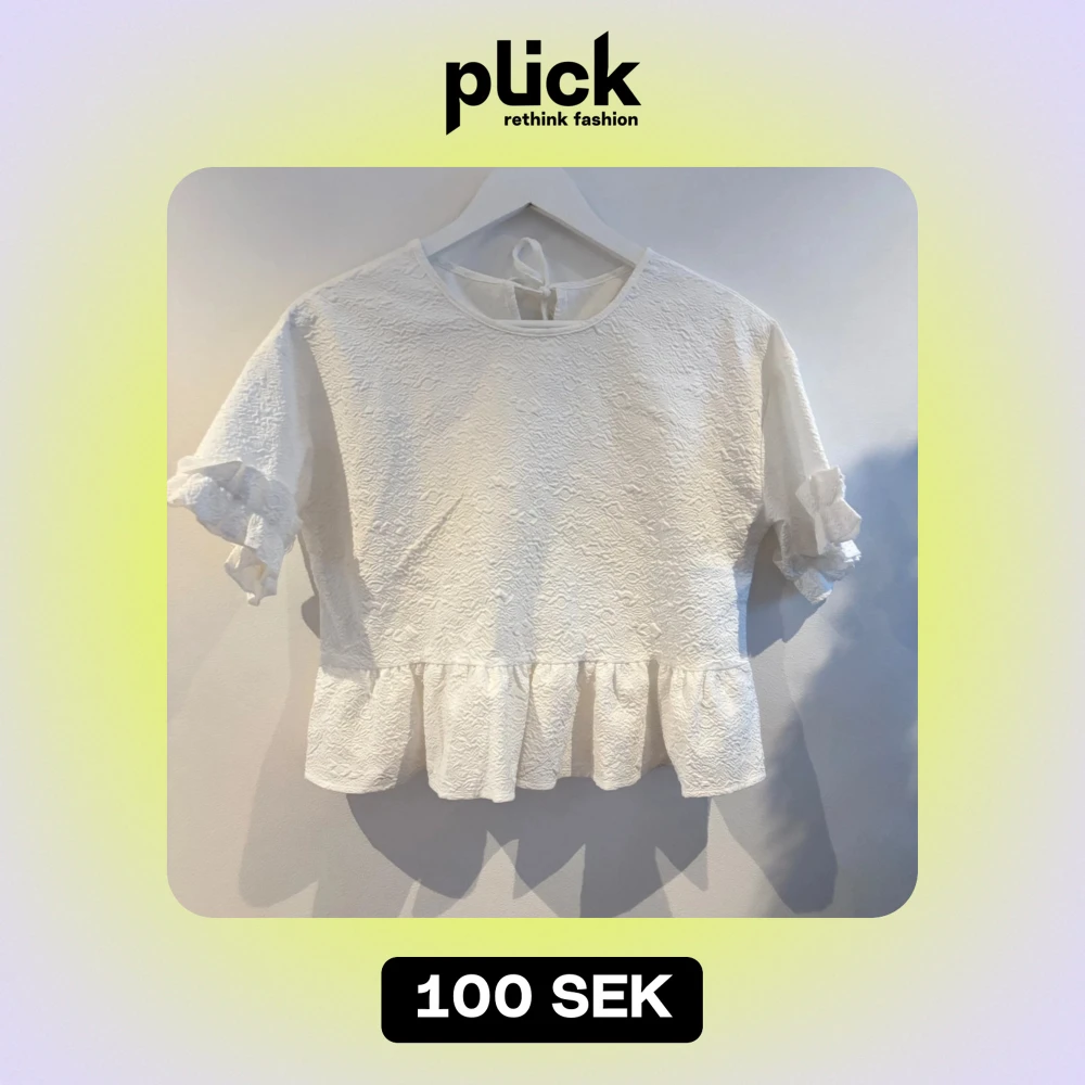 Säljer en söt vit peplumtopp med volangdetaljer på ärmarna och nederkanten. Blusen har en rund hals och knytning i ryggen🩷