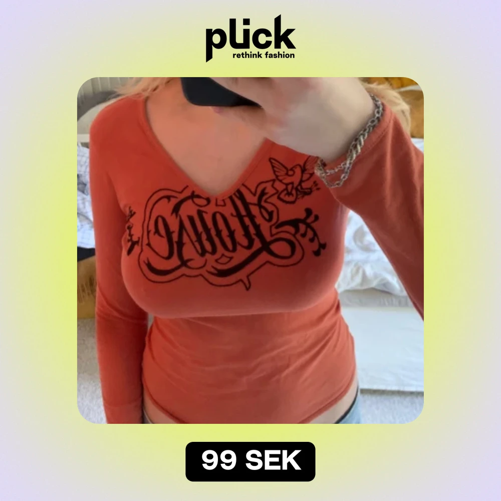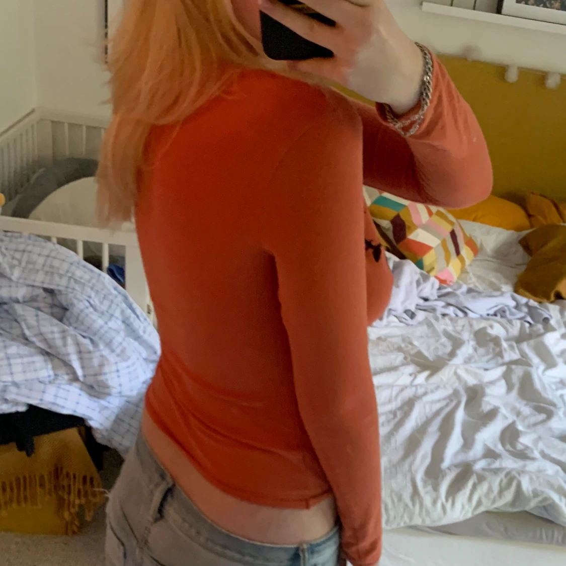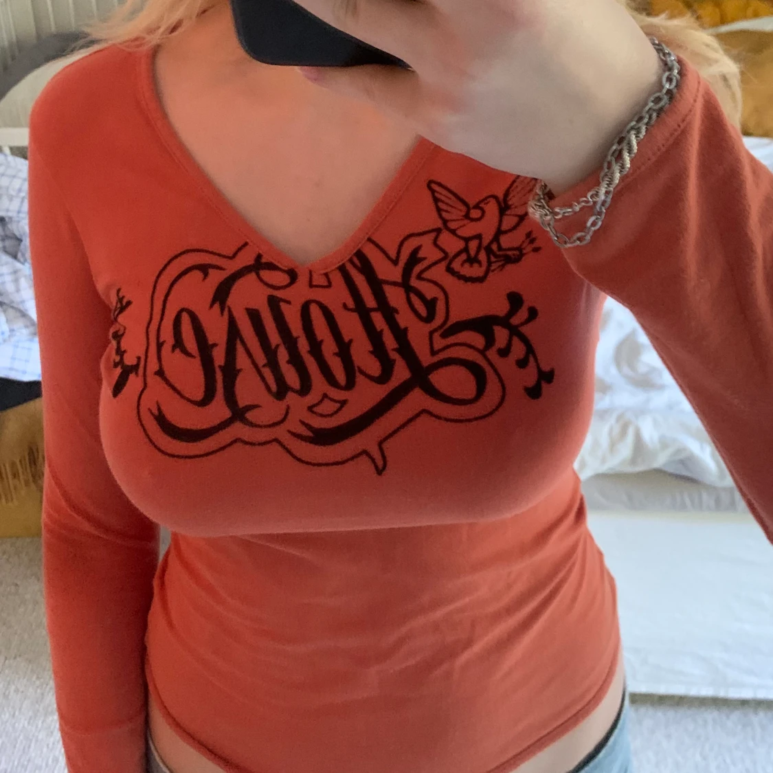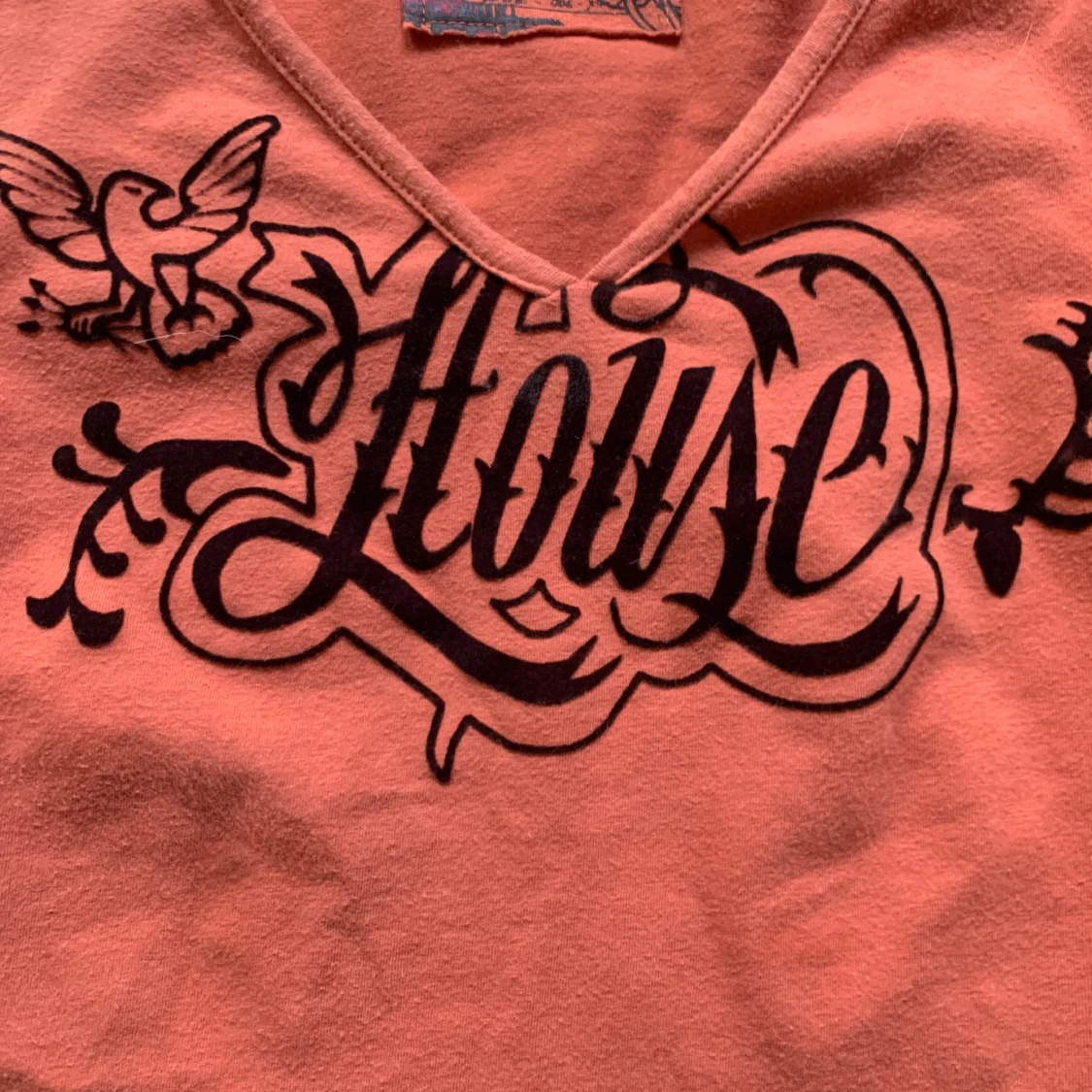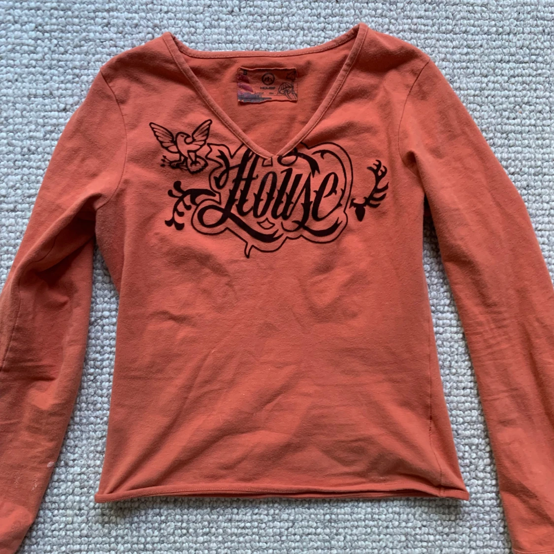 Orange långärmad topp med tryck på. Trycket läser ”House”. Magtröja.